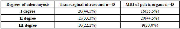 Patients with coagulopathy and iatrogenic bleeding, as well as malignant diseases of any location, were not included in the study. Ultrasound examination of the pelvic organs was performed on days 5-7 of the menstrual cycle in patients with bleeding, and in patients with a delayed menstruation, regardless of the cycle, using the Voluson730-Expert (Japan) devices, which belong to contact scanning systems and operate in real time, with a transabdominal sensor RA 134-8-D and a transvaginal sensor RIC 6-12-D and "Aloka SSD 500" (Japan) with a transvaginal convex sensor with a frequency of 7-12 MHz. Echographically, the size, position, blood supply and structure of the cervix and body of the uterus, the presence of inclusions in the myometrium were determined, the thickness and structure of the endometrium (M-echo), the structure of the ovarian tissue, the presence and volume of fluid in the retro-uterine space were also assessed [1,4]. To make the method more objective, shear wave elastography (SWE) has recently been used. It allows for the quantitative determination of tissue stiffness (elasticity). SWE is a method for the objective quantitative determination of tissue stiffness (elasticity), characterizing the condition of the organs and tissues being examined. Quantitative indicators of the ultrasound elasticity of organs and tissues can include Young's modulus, shear (transverse) wave velocity, elasticity indices (SWE ratio), etc. It is possible to measure and express these indicators numerically as the velocity of a wave diverging from the zone of impact of a high-power acoustic pulse on the object being examined. The stiffer the object being examined, the higher the shear wave velocity. SWE technology is considered more objective and reproducible than CEG [12]. The rigidity of the myometrium in nodular and diffuse forms of its damage, in the presence of adenomyosis, benign myomatous nodes, malignant lesions, determined by elastometry data, differs significantly from that of the unchanged myometrium. The velocity of propagation of a transverse wave in the unchanged myometrium, according to the results of various researchers, can vary within the range from 1.20 to 3.63 m/s, rigidity - 5-114 kPa; in adenomyosis - 2.40-4.50 m/s, 31-180 kPa; in benign myomatous nodes - 0.92-3.97 m/s, 25-55 kPa. The sensitivity of elastometry in the diagnosis of adenomyosis is 76.9-92.2%, specificity - 71.1-88.8% [12]. Ultrasound examination and elastography of the uterus were performed at the Department of Medical Radiology of the Faculty of Postgraduate Education of the SamSU by the assistant of the department, Associate Professor A.S. Ametova.When examining the medical records of patients with adenomyosis, various types of uterine fibroids were detected sonographically in every fifth patient (9 patients, 20%) (Fig. 1). Given the high sensitivity and specificity of a comprehensive ultrasound examination, including Doppler ultrasound and ultrasound elastography, patients in the study group underwent a comprehensive ultrasound examination (Table 1). The following features were used to assign ultrasound signs to the stages of adenomyosis.Table 1. Degrees of adenomyosis in women examined in the comparison group (retrospective analysis)  |