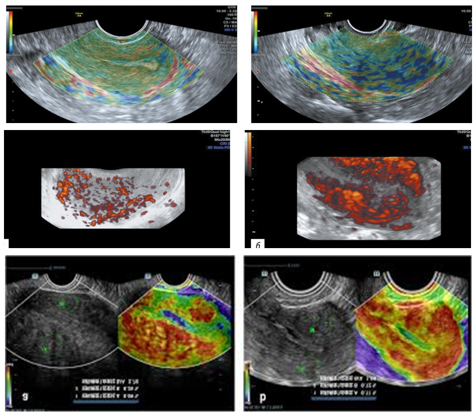 Signs of stage I adenomyosis:• formation of small (approximately 1 millimeter in diameter) anechoic cylindrical structures originating from the endometrium in a direction toward the myometrium;• appearance of small hypo- and anechoic connections in the basal layer of the endometrium, convex or rounded in shape, approximately 1–2 millimeters in diameter;• discontinuous thickness of the basal layer of the endometrium;• serration or unevenness of the base layer of the endometrium;• detection of "bittenness" or localized damage to the endometrium;• the appearance in the myometrium directly adjacent to the uterine cavity of single zones of high echogenicity up to 3 millimeters wide.Signs of grade II adenomyosis:• an increase in the thickness of the uterine walls exceeding the upper limit of normal;• a thickening of one uterine wall compared to the other by 0.4 cm or more;• the appearance in the myometrium directly adjacent to the uterine cavity of zones of increased heterogeneous echogenicity of varying thickness;• the appearance in the zone of increased echogenicity of small rounded anechoic formations 2-5 mm in diameter, as well as fluid cavities of various shapes and sizes containing a fine suspension (blood), and sometimes dense inclusions of low echogenicity (blood clots);• ultrasound signs observed in stage I disease (they are also characteristic of all other manifestations of internal endometriosis).Uterine thickness in stage II adenomyosis is increased in approximately half of patients.Signs of stage III adenomyosis revealed on scans:• uterine enlargement in the main anteroposterior volume;• preferential increase in the thickness of one of the uterine walls;• the appearance of an area of high mixed echogenicity in the myometrium, occupying more than fifty percent of the uterine wall thickness;• the detection of anechoic connections with a diameter of 2–6 mm or fluid cavities of various shapes and volumes, including a finely dispersed suspension, in the echogenic area;• the appearance of numerous adjacent stripes of typical low echogenicity, directed vertically to the plane of recognition, in the painful area. • detection in the area of the leading front of recognition of an area of high echogenicity, and also an anechoic area in the area of the distant front;Ultrasound elastography revealed marked diffuse heterogeneity of myometrial staining in 72% of patients with diffuse adenomyosis. Mixed mosaic staining was observed in 61% of cases (Fig. 2), shades of blue in 33%, and shades of red in 6%. | Figure 2. Ultrasound elastography of the uterus, diffuse and nodular types of adenomyosis |