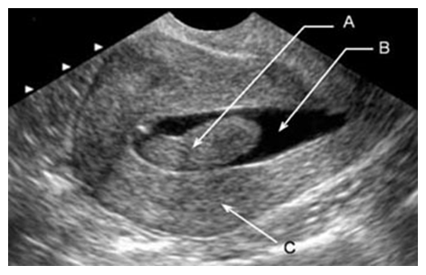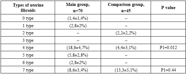 Among the patients in the study group, various types of uterine fibroids were detected by ultrasound in 28 patients (40±4.9%). The detected types of uterine fibroids were classified according to the FIGO classification; intramural fibroids were diagnosed more frequently by ultrasound than other types—7 (25±4.2%).The largest node measured 31 mm in diameter, while the average myomatous node size in both groups was 17.0 (12.0-20.0) mm (Figs. 4, 5, 6). The ultrasound imaging features of the myometrium were also studied (Table 2).Table 2. Frequency of ultrasound signs of myometrial pathology, M±m  |