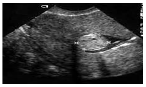 | Figure 5. Patient Kh-va, 49 years old. Source No. 878. Ultrasound image of a submucous node and grade I adenomyosis |