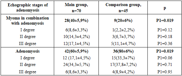 Thus, 40% of patients in the study group and 20% of retrospectively studied patients with adenomyosis had a combination of adenomyosis and uterine myoma. This significant difference is likely due to the lack of a sensitive method such as ultrasound elastography, p < 0.001.There was also a difference in the severity of adenomyosis between patients in the study group and the comparison group (Table 3).Table 3. Echographic degrees of adenomyosis, M±m  |