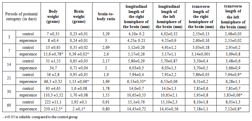 The studies were conducted from 2024 to 2025 in the vivarium of the Tashkent Medical Academy. Permission was obtained from the Center for Bioethics for conducting experiments and the experiments were conducted in accordance with the requirements of the Center. To achieve the goal of the study, 15 female white rats weighing 160-180 grams, previously unborn, not bred, and a total of 220 (control group - 100, experimental group - 120) rat pups born from them were taken. Experimental animals were kept under normal laboratory diet conditions.To achieve the goal, 120 white laboratory rats were used. White laboratory rats were divided into 2 groups. Group 1 consisted of 7 healthy rats as a control group. Mother rats in the control group were given 1.0 ml of saline solution every morning into the stomach. A subclavian catheter was used as a probe. The rats were anesthetized under ether anesthesia on days 7, 14, 21, 30 and 60 after birth. Group 2 was the experimental group, and 8 white female laboratory rats were kept in specially prepared cages to induce experimental metabolic syndrome. This metabolic syndrome model was continued after the rats became pregnant and gave birth to their offspring. For this purpose, the forebrain was prepared in a frontal direction using standard histological sections, and the cell density in pyramidal layers II–III of the prefrontal cortex was calculated by microscopy. The number of neurons in 5 fields from each sample was counted in an area of 1000 μm², and the mean value ± standard deviation was expressed. A Zeiss microscope and ImageJ software were used for morphometry. The tissues were fixed in 10% neutral formalin solution for 24 hours, embedded in paraffin blocks, and 5 μm-thick sections were prepared using a microkeratome. The sections were stained with hematoxylin-eosin (to assess the general histological structure, tissue and nuclear-cytoplasmic ratio) and Masson trichrome (to determine the density of connective tissue and collagen fibers). Table 1 compares the body weight, brain weight and morphometric parameters of offspring born to control and metabolic syndrome mothers at 3, 7, 14, 21, 30 and 60 days of age. According to the results of the analysis, the body weight of the offspring of the experimental group was higher than that of the control group at all age stages. On the 3rd day of postnatal ontogenesis, the body weight of the control group was 7 g, while in the experimental group it was 8 g; at 30 days, it was 93 g and 110.3 g, respectively. | Table 1. Cerebral parameters of laboratory rat pups in the control group |