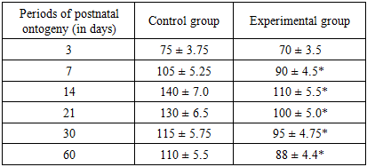 When comparing the cerebral cortex of the rats in the control and experimental groups, it was found that by the 14th day of the experiment, neurocytes had lost their typical pyramidal shape. These cells had acquired a long shape with no clear boundaries. On the 14th day of the experiment, it was found that the density of neurons in the rats born to mothers with metabolic syndrome was higher than in the control group. When comparing the histological structure of the brains of the offspring born to mothers in the experimental and control groups, it was found that by the 14th day, the cortex was fully formed. In the rats in the experimental group, as in the control group, bipolar cells with 2-4 nuclei were detected in the cerebral cortex. The 2nd and 3rd layers of the cerebral cortex are densely located. At this time, the difference in the brains of the rats in the control and experimental groups is not noticeable. The cortical neurocytes in the experimental group are relatively round and smaller in size than those in the control group. These neurocytes have a small rim in their cytoplasm, and the nucleus is brightly colored and relatively larger in size. On day 14, the prefrontal cortex of the control group is characterized by high cell density, a clear layered structure, and active synaptogenesis.However, in the experimental group of children born to mothers with metabolic syndrome, the cell density remains low, and the number of mature neurons in layers II–III is statistically significantly reduced (p<0.05).In control animals, basophilic substance is formed in the form of flakes in the apical and basal zones of the cytoplasm of large cells, while in experimental animals, the cytoplasm of such cells is diffusely stained with thionin, and Nissl substance is located in the perinuclear area of the cytoplasm.The brains of the offspring born to rats from the control group are fully formed by day 21, the morphological structure of neurocytes is fully formed. In most of the cells of various sizes, both large and small, in different layers of the cortex, basal growths are clearly visible, and the nuclei are mainly round in shape.The neurocytes in the brains of the offspring in the 21-day experimental group were pale in color, with poorly developed cytoplasm, round in shape, and neurocytes were often located perinuclearly, and in some neurocytes they were located in the basal region. Neuroocytes had a rough structure, and the boundaries of the nucleus were clear. By this period of the experiment, a decrease in neurocytes was observed. It was found that the sizes of neurocytes were smaller than those in the control group at this day of the experiment. This was especially clearly reflected in the cytoplasm. The boundaries of the cytoplasm and nucleus were not clear when compared with the control group. The location of the basophilic substance in the cytoplasm of neurocytes located in the hippocampus differed from that in the control group. It was found that the basophilic substance was located in the center of the cytoplasm, and the periphery was more fluid. By the 21st day of the experiment, pathologically changed cells began to be detected in the hippocampus. Here, solitary cells with a whitish cytoplasm and a swollen nucleus could be found.By the 30th day of the experiment, it was found that large and medium-sized neurocytes of the hippocampus were vacuolated, and there was a perinuclear swelling in their cytoplasm. The boundaries of the nuclei of these cells were clearly defined, and the nucleus was visible in the form of a small black dot. At this time, shadow cells of neurocytes were detected. At this time, focal lysis of neurocytes was detected.By the 60th day of the experiment, the structure of neurocytes in the experimental group was different from that in the control group. By this time, cells with vacuolated cytoplasm were found singly, and the cytoplasm of neurocytes mainly had a reticular structure. Basophilic substance was located around the nucleus. The nuclei of these cells were found to be of a fluid color. Their size was increased compared to that in the control group. Chromatin balls were found to be located in most cases on the periphery of the nucleus. By the 60th day, the cellular architecture of the prefrontal layer in the control group was stabilized and layered structures were fully formed. In the experimental group, the cell density is much less compared to the control, there is a violation of the layer structure, a decrease in the number of pyramidal neurons, and an increase in glial elements. This indicates that the process of chronic neuroinflammation continues in the brain tissue.Thus, the results of this study showed that offspring born to mothers with metabolic syndrome experience morphological changes in the cerebral cortex.Table 2 consistent increase in cell density was observed in the control group at different periods of postnatal ontogenesis: on the 3rd day — 75 thousand h/mm², on the 7th day — 105 thousand h/mm², on the 14th day — 140 thousand h/mm², on the 21st day — 130 thousand h/mm², on the 30th day — 115 thousand h/mm² and on the 60th day — 110 thousand h/mm². In the animals of the experimental group (children born to mothers with metabolic syndrome), these indicators were lower: 70, 90, 110, 100, 95 and 88 thousand h/mm², respectively.Table 2. Cell density in the prefrontal layer (thousand cells/mm²)  |
