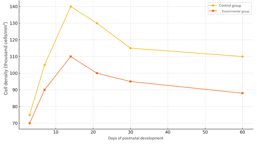 The obtained data show that due to the presence of metabolic syndrome in the mother, the processes of neuronal growth and differentiation in the prefrontal layer of children experience a long-term decline. In particular, a 20–25% decrease in cell density compared to the control group from day 14 to day 60 is a clear indication of this inhibitory effect (Figure 1). | Figure 1. Dynamics of neuronal growth of cells in the prefrontal layer |