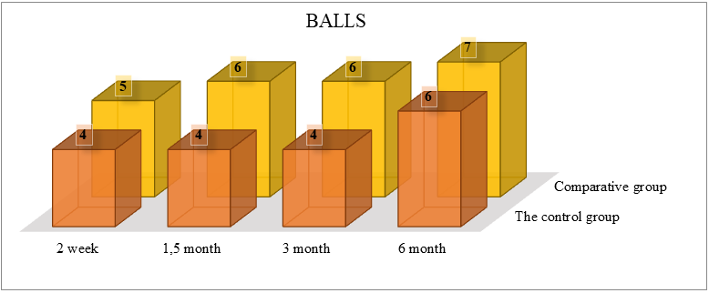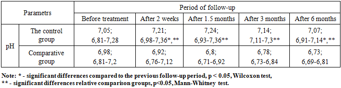 Marked variations in the pH levels of the combined saliva can be observed among individuals in the research groups with completely removable dentures both in the initial phases and in the long run (Table 2). However, a dynamic analysis of outcomes in a group of patients with ozone therapy revealed no significant differences compared to baseline.Table 2. Variation of pH levels in combined saliva among individuals with complete removable denture prosthetics (n = 46)  |