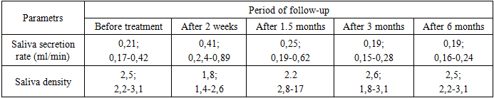 The analysis indicates that the cleanliness of removable dentures treated with ozonated olive oil remains significantly high (on average, it decreases by 1 point after 2 weeks, 2 points after 1.5 and 3 months, and by 1 point after 6 months). Nevertheless, it can be observed that in both groups, the condition is progressively declining, and after several months of using the prostheses, it becomes insufficient.An examination of the characteristics of mixed saliva indicated that localized ozone treatment generally did not produce notable alterations in the examined metrics, such as the decomposition rate of mixed saliva and its thickness. Its application in individuals with partially and fully removable dentures resulted in some alterations in parameters - an elevation in the salivary secretion rate paired with a decrease in its adhesive properties, and approximately 1.5 months later, these metrics reverted to their baseline values. There were indications of hyposalivation in a segment of patients over an extended period (Table 1). Comparing these findings with those from the control group does not permit us to claim any substantial differences.Table 1. The interaction of various glacial features contrasted with the context of local ozone management (n=46)  |