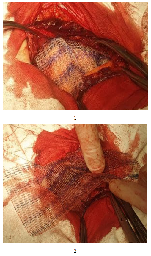 The study is based on the results of examination and treatment of 121 patients with ventral hernias and morbid obesity who underwent surgery in the surgical department of the 1st clinic of Samarkand State Medical University between 2015 and 2024. All patients underwent planned surgery, and depending on the chosen treatment approach, the patients were divided into two groups. The first group, the comparison group, consisted of 54 patients with ventral hernias and morbid obesity who underwent hernioplasty alone. The second, main group consisted of 67 patients who underwent hernioplasty combined with abdominoplasty.Of the 121 patients, 37 (30.6%) were men and 84 (69.4%) were women. Age distribution: up to 45 years - 22 (18.2%), 46-59 years - 67 (55.4%), 60-74 years - 29 (23.9%), 75-80 years - 3 (2.5%).All patients underwent anthropometry to determine their body weight. All patients had morbid obesity - alimentary in nature, due to dietary habits, combined with low physical activity. Excess body weight was assessed according to the WHO experts' classification. Patients were classified according to the A. Matarasso (1989) classification based on the degree of anterior abdominal wall ptosis. Minimal and moderate ptosis (I-II degree) was observed in 34 and 42 patients with obesity of the III-IV degree, respectively, in the studied groups. Moderate and severe ptosis (III-IV degree) was observed in 20 and 25 patients with III-IV degree obesity.Out of 121 patients with ventral hernias and morbid obesity, 90 (74.4%) had comorbid diseases. Among these, 49 patients had 1 additional pathology, 29 had 2, and 12 had 3 concomitant diseases of other organs and systems. Among comorbidities, cardiovascular diseases were the most common, occurring in 82.6% of cases, followed by respiratory system pathology in 9 (7.4%) patients, varicose veins of the lower extremities in 20 (16.5%) patients, and diabetes mellitus in 32 (26.4%) patients.According to the classification by Chervel J.P. and Rath A.M. (1999), the vast majority of patients (85 - 70.2%) had supraumbilical (M1) and periumbilical (M2) hernias. The lowest number of patients had lateral (L) 9 (7.4%) and combined (M+L) 3 (2.5%) ventral hernias. 46 (38.0%) patients had large (W3) and giant (W4) hernias. Out of 121 patients, 40 (33.0%) had primary ventral hernias, 50 (41.3%) had postoperative ventral hernias (R0), and 31 (25.6%) had recurrent ventral hernias (Rn).Among the instrumental research methods, computed tomography hernia abdominometry (CTHA) performed on 58 patients in the main group proved to be the most informative. CTHA made it possible to identify defects in the topography of the anterior abdominal wall, determine the relative volume of the hernia in relation to the abdominal cavity volume, plan adequate preoperative preparation, and choose the optimal method of repair. According to our studies, with a relative volume of the hernial protrusion up to 14.0% of the abdominal cavity volume, it is possible to use tension methods of hernioalloplasty - implantation of an "onlay" endoprosthesis with suturing of the defect.With a volume greater than 14.1%, preference was given to tension-free repair methods. In 46 (68.6%) patients of the main group with ventral hernias and morbid obesity at the preoperative stage, we conducted adaptive training to increase intra-abdominal pressure using the proposed improved pneumatic belt-bandage. The use of this technique in patients with ventral hernias W3-W4 and morbid obesity allowed for a reduction in the risk of developing compartment syndrome.In the comparison group (n=54), hernioalloplasty was performed using tension methods in 37 (68.5%) patients and tension-free methods in 17 (31.5%) patients.In the main group, the choice of hernia alloplasty was differentiated and supplemented with abdominoplasty according to our proposed program (certificate of state registration of the computer program No. DGU 10983, Intellectual Property Agency of the Republic of Uzbekistan - 2021). The patients in the main group were divided into 4 subgroups based on the program results.Patients in the 1st subgroup with a total score of up to 5, as well as with a hernia protrusion volume of up to 14% of the abdominal cavity volume according to CT hernia abdominometry data, underwent "onlay" mesh implantation with suturing of the hernia defect. This group consisted of 24 (35.8%) patients with morbid obesity and grade III-IV abdominoptosis, for whom hernia alloplasty was supplemented with abdominoplasty.In the 2nd subgroup, with a score of 6 to 10 and taking into account CT hernia abdominometry data showing a hernial protrusion volume greater than 14.1% of the abdominal cavity volume, we performed tension-free repair. To increase the volume of the abdominal cavity and prevent the development of abdominal compartment syndrome, after delimiting the abdominal cavity with a flap of the hernia sac, abdominal wall repair was performed by placing a mesh on the aponeurosis without suturing it. Mesh fixation was carried out using pre-placed U-shaped sutures encompassing all layers of the musculo-aponeurotic wall up to the peritoneum.In 12 (17.9%) patients of the 3rd subgroup of the main group with hernia defect sizes greater than 10 cm and hernia protrusion volumes exceeding 18% of the abdominal cavity volume, as determined by CT hernioabdominometry, a combined tension-free hernioplasty "onlay + sublay" was performed. This involved placing one implant behind the musculoaponeurotic layer after delimiting the abdominal cavity with a flap of the hernia sac, and positioning the second implant above the aponeurosis (Fig. 1). | Figure 1. Stages of endoprosthesis fixation"sublay" (1) and "onlay" (2) using pre-placed U-shaped sutures |