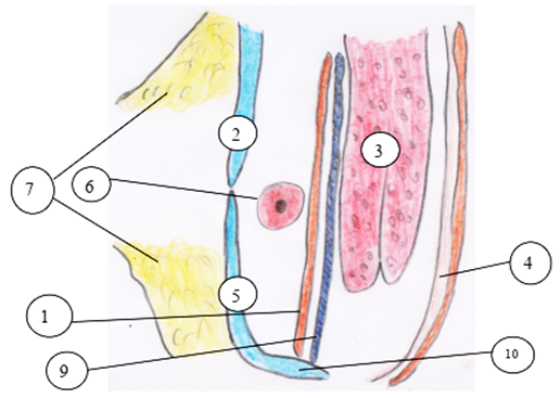 In order to minimize the likelihood of adverse outcomes in the postoperative period after open inguinal hernioalloplasty, which was observed in patients in the comparison group, 67 patients in the main group underwent open hernioalloplasty using our modified technique.The technique includes a layer-by-layer opening of the anterior wall of the inguinal canal with the identification and mobilization of the spermatic cord, which is taken onto a holder and withdrawn. The hernial sac, after its careful dissection in the thickness of the cord, is carefully isolated, opened and its contents are inserted into the abdominal cavity.The bag is mobilized in the direction of the inner inguinal ring with separation from the surrounding elements. The base of the bag is hermetically sealed with a pouch seam using absorbable atraumatic material (Vicryl 3/0). A flap is formed from the remaining part of the hernial sac, a section of the parietal peritoneum, intended for the subsequent concealment of the implant.At the next stage, a polypropylene mesh implant is modeled and laid (the average size is 10×12 cm), taking into account individual anatomical parameters: the size of the posterior wall of the inguinal canal and the height of the hernial defect. The implant is positioned along the posterior wall of the canal in such a way as to reliably overlap the inner inguinal ring without compressing the structures of the spermatic cord. Graft fixation is performed with U-shaped sutures (Prolene 4/0) along its upper and lower edges.A pre-formed flap of the parietal peritoneum is placed on top of the mesh graft, which is fixed to the upper and lower walls of the inguinal canal with 6-8 nodular sutures (Vikril 4/0). This ensures reliable biological isolation of the synthetic material from the surrounding tissues, including the structures of the spermatic cord.The spermatic cord is placed on the formed "biological bed" — a flap of the parietal peritoneum, excluding its direct contact with the implant (Fig. 2). The final stage of the operation is suturing the aponeurosis of the external oblique abdominal muscle without tension, "edge to edge", over the spermatic cord, followed by a standard skin suture. | Figure 2. Schematic image of the modified method, sagittal section: 1-hernial sac; 2-upper flap of aponeurosis of the external oblique abdominal muscle; 3-free edges of the internal oblique and transverse abdominal muscles; 4-transverse fascia; 5-lower flap of aponeurosis of the external oblique abdominal muscle; 6-spermatic cord; 7-subcutaneous adipose tissue; 8-allograft with pre-applied U-shaped sutures; 9-fixed allograft to the posterior wall of the inguinal canal; 10-lower wall of the inguinal canal, inguinal ligament |