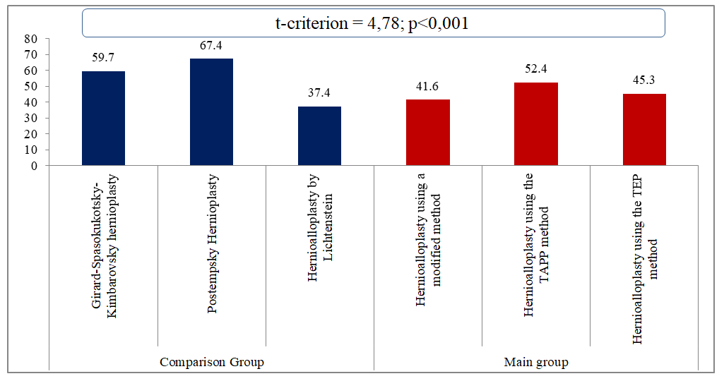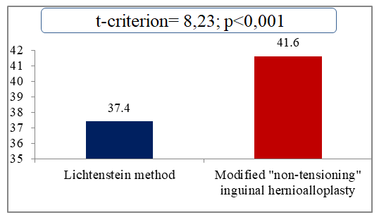 A comparative analysis of the duration of operations showed that our modified inguinal hernioalloplasty technique is comparable in time to classical hernioalloplasty using the Lichtenstein technique. Thus, the average duration of the operation according to the Lichtenstein method was 37.4 ± 0.5 minutes, whereas using the modified technique it was 41.6 ± 3.8 minutes (Fig. 3). | Figure 3. Comparative indicators of the duration of open inguinal hernioalloplasty (min.) |