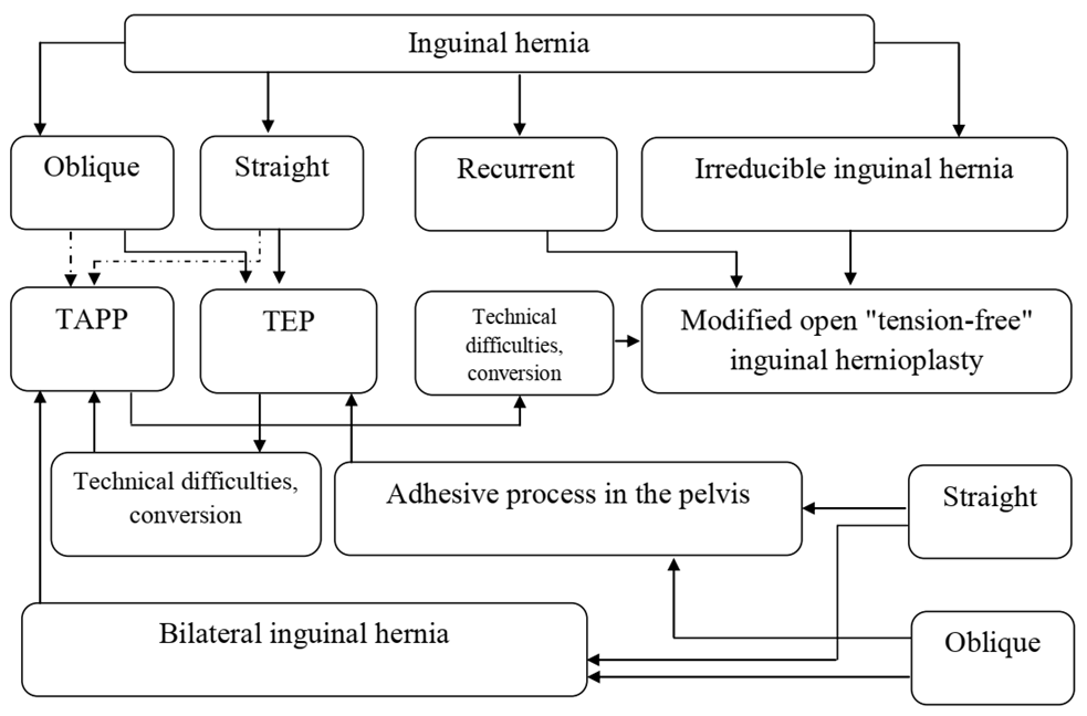 Inguinal hernias remain one of the most common pathologies requiring surgical intervention, which determines the high social and economic importance of this problem in modern clinical practice. Despite the many hernioplasty techniques developed, the issues of optimizing the choice of surgical tactics remain relevant due to the variety of clinical manifestations, anatomical and physiological characteristics of patients and possible postoperative complications [6,9,11,13]. Traditional hernioplasty methods, despite their proven effectiveness, are associated with a number of limitations, including a long recovery period, the risk of relapses and complications affecting the reproductive function of men [3,5,12,15].In recent years, considerable attention has been paid to the introduction of modified and minimally invasive endovideosurgical techniques, which demonstrate advantages in reducing postoperative traumatism and improving the quality of life of patients. However, choosing the optimal treatment strategy requires an integrated approach and in-depth analysis of the results of using various techniques in clinical practice [1,7,10,14].The development of a sound algorithm for the surgical treatment of inguinal hernias, based on a comparative analysis of modern and traditional hernioplasty methods, is an important step towards standardizing the treatment process, reducing the incidence of complications and relapses, and improving the overall effectiveness of surgical intervention [2,4,8,16]. The present study is aimed at solving this problem and is of high practical importance for specialists in the field of surgery and urology.The purpose of this study is to increase the effectiveness of surgical treatment of patients with inguinal hernias by improving the technical aspects of hernioalloplasty.