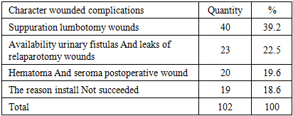 Thus, the sizes of the hernial orifices in patients with PAH were as follows: W1 (up to 5 cm) in 12 (17.6%), W2-(5-10 cm) – in 27 (39.7%), W3- (10-15 cm) – in 20 (29.4%) and W4-(more than 15 cm) – 9 (13.2%). At the same time, the number of relapses of this contingent of patients was as follows: there were no relapses of the disease in 46 (67.6%) patients, R1 – in 10 (14.7%), R2- in 8 (11.7%) and R3- in 4 (5.9%).In patients with PPBG hernias, the hernial defect sizes were W1– in 10 (29.4%), W2– in 16 (47.1%), W3– in 4 (11.7%), and W4– in 4 (11.7%). The number of disease recurrences was absent in 21 (61.7%), R1– in 5 (14.7%), R2– in 4 (11.7%), and R3– in another 4 (11.7%). In general, in both groups of patients with PAH (LL4) and PAHB (L3), the sizes of the hernial orifices were as follows: W1 - (up to 5 cm) in 22 (21.5%), W2- (5-10 cm) - in 43 (42.1%), W3- (10-15 cm) - in 24 (23.5%) and W4- (more than 15 cm) in 13 (12.7%) patients. By the number of relapses: there were no relapses of R0- in 67 (65.7%), R1- in 15 (14.7%), R2- e 12 (11.7 %) and R4- in 8 (7.8%).All patients with postoperative lumbar (POL) and postoperative anterolateral abdominal hernias (POAAH) had previously undergone surgery for surgical diseases of the kidneys and ureter. In 75 (73.5%) cases, surgical interventions were are given in the presence of stones in various parts of the kidneys and ureter; in 27 (26.5%), surgical interventions were performed due to purulent-septic diseases.Of lumbotomy accesses was noted in 40 (39.2%) cases after urological interventions, urinary wound fistulas and leaks were noted in 23 (22.5%), hematomas and seromas of wounds were noted in 20 (19.6%), and the cause of the development of PAH and POAAH hernias could not be determined from the medical documentation provided in 19 (18.6%) cases.Table 2. The nature of previously suffered wound complications in patients with POL and PPBG (n=102)  |