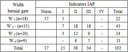 In 58 (56.8%) observations, patients with POL and POAH hernias complained of the presence of a protrusion and the appearance of pain, and 21 (20.6%) patients worried sharp thinning skin V areas hernial protrusion. In 3 (2.9%) observations, patients were concerned about the presence of trophic ulcers in the area of an extensive lateral hernia.For forecasting possible development of early postoperative complications All patients underwent measurement IAP. Assessment indicators The IAP was carried out depending on the size of the hernial orifice (Table 3).Table 3. Indicators of IAP depending on the width of the hernial orifice (n=102)  |