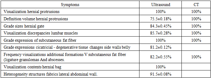 Among patients with small hernias share having degenerative the changes were 33.1%, with average -53%, with large ones - 92%, with giant ones -100%.Atrophic changes of varying severity were detected in all 48 patients examined by ultrasound. It should be noted that with short terms of hernia carriage, and also its small size during ultrasound revealed a weak degree atrophy muscle tissue (n=9) - 18.7%, moderate atrophy - in 27 (56.2%) and severe - in 12 (25%) patients.Among the radiation methods for diagnosing POL and POAAH, a special place is occupied by complex computed tomography (CT) performed according to indications 13 patients with PAH (n=8) and POLH (n=5). In CT of the lumbar region, abdominal wall, this contingent of patients, changes depending, as a rule, on the localization of the hernia, its size, the contents of the hernial sac.For a comparative study of the information content of ultrasound and CT in the diagnosis of features anatomical and functional To determine the structure of the lumbar and anterolateral abdominal wall around the hernial protrusion, as well as to determine the size of the hernial protrusion and hernial orifice in patients with PAH and PAH, an analysis of the study results was conducted in 48 patients (table 5).Table 5. Comparative analysis of ultrasound and CT data in assessing changes in the lateral abdominal wall in patients with postoperative lumbar and lateral hernias (in%)  |