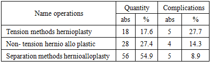 To select the method and volume of surgery for POL and POAH abdominal hernias, we followed a differentiated surgical tactic, which was based on objective data and the results of instrumental research methods.According to the objective criteria given, various volumes of POL and POAH hernias were performed and the nature of surgical interventions (Table 6).Table 6. The nature of surgical interventions for PAH and POAAH hernias (n=102)  |