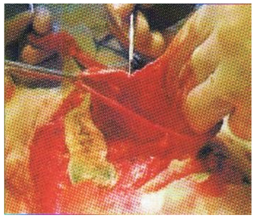 As can be seen from the table presented, the separation method of hernioplasty was most frequently performed in 56 (54.9%) cases, non-tension methods in 28 (27.4%) and tension methods of hernioplasty in 18 (17.6%) cases. In the postoperative period, after tension methods of hernioplasty, complications occurred in 27.7% (n = 5) cases, whereas after " non-tension " and combined methods of hernioplasty, they amounted to 14.3% (n = 4) and 8.9 % (n = 5).According to the proposed separation method of hernioplasty, recovery integrity of the muscular- aponeurotic layer of the lateral abdominal wall, elimination of deformation and asymmetry of the abdomen due to the use of endoprostheses “Vipro Ethocon” and “Esfil” Lintex. Polypropylene mesh endoprosthesis were placed and fixed into one formed retromuscular space between the outer and inner oblique muscles - from the Spigelian line to the lumbar muscles and from the lower edge of the costal arch to the iliac crest According to the “ tension - free ” principle, insufficient space was necessarily drained.After excision of the old postoperative scar bordering cuts layer by layer separated external and the internal oblique muscles, as well as the transverse muscle and fascia (Fig. 5, 6). | Figure 5. Separation external and internal oblique muscles, as well as the transverse muscle and fascia |