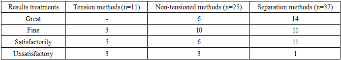 Necessary separate and highlight interfacial lateral structures abdominal walls within the entire anatomical region, from the lower edge of the costal arch to the iliac crest bones and from the Spigelian line (pararectal) line to the longitudinal muscles of the back and lumbar muscles. This stage was carried out carefully, without allowing excessive damage to the agrophilic and flabby muscles of the lateral abdominal wall. After this The hernial sac was submerged, and the transverse fascia and muscles, as well as the internal oblique muscle above the hernial sac, were sutured.These anatomical structures were sutured along their entire length without tension. A flat area was formed so as to achieve the elimination of the existing deformation and asymmetry of the abdomen by adequately matching the interfacial layers of the lateral region with each other, as well as uniform invagination, application or displacement and matching of muscle bundles with each other, if necessary. Then, a polypropylene was placed and fixed over the internal oblique muscle of the abdomen endoprosthesis: from the lower edge costal arch to the iliac crest and from the Spigelian line to the longitudinal muscles of the back and lumbar muscles.The prosthesis was fixed with a polypropylene thread continuously or with interrupted sutures, stepping back from each of its edges by 4-5 cm. supra-reticular space drained with silicone perforated with a pipe within 5 days. After which the external oblique muscle was sutured.In patients after separation techniques, serous-hemorrhagic fluid was released from surgical wounds during the first 5-6 days, and then serous fluid within 7-10 days. In the group of patients who underwent tension-free hernioplasty techniques, the volume of fluid released from the wound ranged from 26.5 ± 1.2 ml in the first day before 5.2±1.3 ml on the tenth day, and in the group of patients operated by a combined method, respectively, from 25.3±2.1 ml up to 3.6±1.2 ml. The peak value of the exudative reaction occurred on the third day of the postoperative period, when in patients with " non-tension " hernioplasty the amount of secreted fluid was 56.7±4.3 ml, and in the group of patients with combined hernioplasty - 45.5±4.2 ml. The conducted study of the course of the inflammatory reaction in response to the implantation of prostheses did not reveal significant differences.In the immediate postoperative period after performing tension methods of hernioplasty, postoperative complications were noted in 5 (27.7%) observations. In 4 cases, wound complications were noted in the form of: suppuration (n=2), seroma (n=1) and hematoma (n=1). Only In one observation, postoperative pneumonia was diagnosed. Complex conservative therapy with the use of antibacterial agents allowed this patient to be treated. In the presence of postoperative wound complications, local treatment was performed using 2-3-4 punctures under ultrasound control.In the group of patients who underwent tension-free hernioplasty techniques (4; 14.3%), the presence of seroma was diagnosed in 2 observations using ultrasound. The presence infiltrate at 1 And at 1 suppuration wounds.After performing the separation technique of hernioalloplasty, postoperative wound complications were diagnosed in 5 (8.9%) patients. In 5 observations, the presence of hematoma (n=2) and seroma (n=2) and infiltrates were diagnosed by ultrasound (n=1).Remote results over a period of 1 to 6 years were studied in 73 patients out of 102. At the same time, 11 (15.1%) patients had previously undergone tension methods of hernioplasty, 25 (34.2%) non-tension and (37 50.7%) separation methods (Table 7).Table 7. Indicators of remote results of surgical treatment of postoperative lumbar and lateral hernias (n=73)  |
