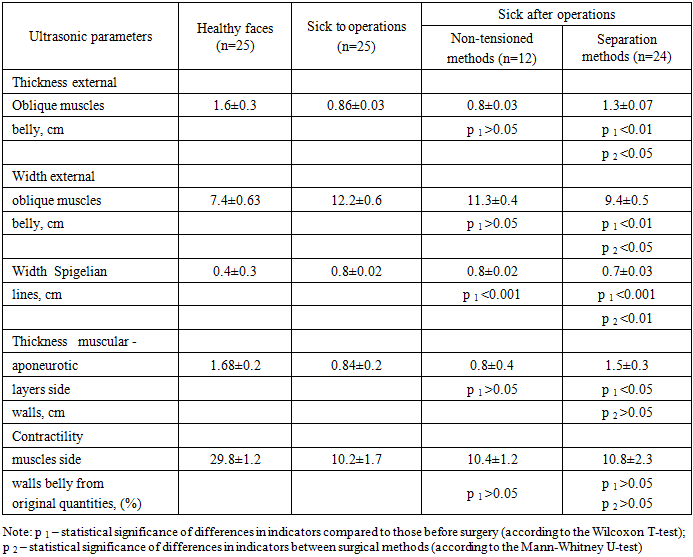 When assessing long-term results, great importance was attached to the results of ultrasound examination concerning the anatomical and functional state of the muscles of the lateral wall (Table 8).Table 8. Ultrasound characteristics of the anatomical and functional state of the lateral abdominal wall before and after surgery (M±m)  |