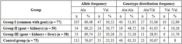 Introduction. Gout is a condition that involves inflammation in the joints and the build-up of uric acid crystals in different tissues, which causes serious pain, swelling, and inflammation. Gout is one of the oldest conditions known to humans. Among rheumatic diseases, gout is considered the most studied, understood, and well-controlled nosologically entity. Research materials and methods. The research work was carried out at the central hospital of the Samarkand City Medical Association. For the dissertation work, a comprehensive approach was used, including clinical, laboratory, biochemical, immunological, ultrasound, radiological, CT, and statistical research methods. The study examined 111 patients with primary gout, who were divided into 3 groups: 1st group (n=34), patients diagnosed with primary gout without damage to internal organs. 2nd group (n=39), patients with primary gout with kidney damage and patients with primary gout with liver and kidney damage 3rd group (n=38). Research results. The average age of the patients was 55.9±8 years (from 29 to 65 years). Patients aged up to 43 years - 21.33%, from 44 to 58 years - 52%, from 59 to 65 years - 26.67%. The average age of patients at the onset of the disease was 44.8±8 years. In most patients (71.1%) the onset of the disease was observed on average at the age of 35-52 years. The average duration of the disease upon admission was 5.2 (1.0;10.0 years). Conclusions. Thus, our results showed no association between the Ala22Val polymorphism in the MTHFR gene and the development of gout in our patients, which contradicts the data of some scientific studies, where a predisposing effect of the mutant Val allele on the development of GU and gout in the adult population was found.