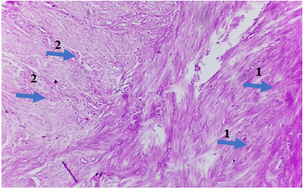 The mucous membrane forms a relief in the form of folds, which becomes even more pronounced in the cervix. The endometrium is formed by two layers (plates) of epithelial and proper. Epithelial plasticity is represented by a single-layer prismatic epithelium, in areas multi-row. The epithelium contains ciliated and glandular, as well as basal cells. The epithelium of the uterus is involved in the formation of glands, which have morphological differences in the body and cervix. Thus, in the body of the uterus, the mouths of the glands are wide and deep, slightly branched; in the cervix they are shorter, and the end sections are branched.The myometrium of the uterus of white mongrel rats, as well as in other mammals, is formed by bundles of smooth muscle tissue separated from each other by layers of loose fibrous tissue. Using immunohistochemical examination of the uterus, it was established that in the horns and body the myometrium consists of three layers: internal (submucosal), formed by circularly oriented myocytes; middle (vascular) with a small number of obliquely oriented smooth myocytes; external (supravascular) with obliquely longitudinal cells (Fig. 2). Many scientists have described only two layers in the myometrium [13]. In the caudal direction, the medial walls of the right and left horns of the uterus merge. The area of fusion is characterized by the unification of the outer shell of the perimetry and part of the myometrium, namely its supravascular and vascular layers. Thus, in the lower segment, a median septum is formed, dividing two cavities of the indistinctly defined body and cervix. The median septum in its structure is formed by the endometrium and myometrium. At the same time, the myometrium in its structure has submucosal layers and a single vascular layer. The vascular layer is more pronounced in the body. | Figure 2. Morphological structure of the uterus (myometrium) of a white mongrel rat before long-term use of energy drinks (normal) Stained with Schiff reagent and hematoxylin. Magnification 10x20. 1 - smooth muscles; 2 - circular muscles |