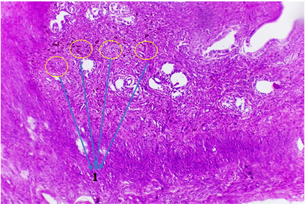 In (Fig. 3) the granules of mucopolysaccharides (glycosaminoglycans) that are part of collagen and give a positive reaction to PAS are outlined in yellow.PAS or PAS reaction is a qualitative reaction to aldehydes.PAS is a non-specific reaction. Interaction with many substances is difficult due to their unique structure. | Figure 3. Morphological structure of the uterus of a white mongrel rat after long-term consumption of energy drinks. Staining with Schiff reagent and hematoxylin. Positive PAS reaction for uterine tissue. Magnification 10x20. 1- proliferation and increase in the amount of type III collagen. (Reticular fibers) |