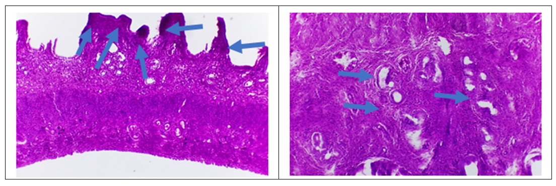 Glycosaminoglycans (part of collagen) mucopolysaccharides (from Latin mucus - mucus) - carbohydrate part of proteoglycans, polysaccharides, which include amino sugars-hexosamines. In the body, glycosaminoglycans are covalently linked to the protein part of proteoglycans and are not found in free form. The middle layer of the cervix is formed mainly by dense unformed fibrous connective tissue, where the leading functional tissue element is the intercellular substance with its fibrous part. Immunohistochemical typing of collagens of types I, II, III, IV, VIII showed that the maximum positive expression is determined for types I, III and IV, regardless of childbearing age [14].(Fig. 4) After long-term consumption of energy drinks in albino rats, significant changes in the morphological structure of the uterus are observed. When stained with Schiff reagent and hematoxylin and then enlarged, a positive PAS reaction was found in the uterine tissue. This indicates the proliferation and increase in the amount of type III collagen, which is represented by reticular fibers. Type III collagen is a key element in the structure of connective tissue and its increase may indicate the processes of fibrosis and tissue remodeling. In addition, metaplasia of the epithelium of the endothelial layer of the uterus was also detected. Metaplasia is a process in which one cell type is transformed into another cell type. In this case, the epithelium of the endothelial layer of the uterus underwent changes, possibly as an adaptive response to long-term exposure to energy drinks. These changes in the morphological structure of the uterus indicate potential pathological processes that may be associated with long-term consumption of energy drinks and require further study and attention. The fiber bundles expressing collagen types I and III in the cervix have a multidirectional course (Fig. 5). These types of collagen belong to the class of fibril-forming collagens, which participate in the formation of the stroma of parenchymatous organs experiencing constant or periodic mechanical load [15-18]. It is during pregnancy that the cervix realizes its support-mechanical function. | Figure 4. Morphological structure of the uterus of a white mongrel rat after long-term consumption of energy drinks. Staining with Schiff reagent and hematoxylin. Positive PAS reaction for uterine tissue. Magnification 10x20. proliferation and increase in the amount of type III collagen. (Reticular fibers). metaplasia of the epithelium of the endothelial layer |