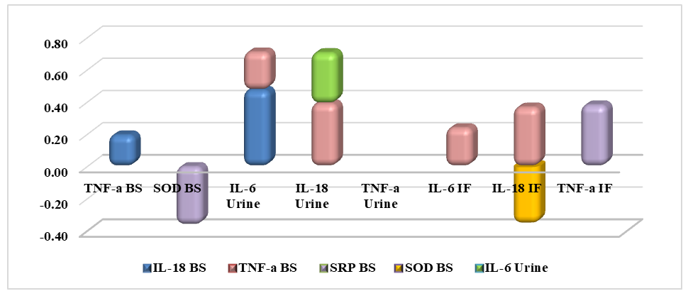 The conducted correlation analysis showed multidirectional relationships between immunological indices in various biological fluids. The obtained data reflect the complex nature of the interaction of the systemic and local inflammatory response in acute purulent-destructive orchiepididymitis. The presence of both positive and negative relationships indicates the existence of several pathogenetic mechanisms, including both activation and regulation of inflammation. The most pronounced associations were noted between systemic cytokines and local markers.A moderate positive correlation was found between the level of IL-6 in urine and IL-18 in serum (r = 0.47). This indicates a close interaction between the systemic inflammatory response and the local reaction of the urogenital tract. IL-18, as a key inducer of the production of proinflammatory mediators, enhances the activity of IL-6, which reflects the severity of the inflammatory cascade. Thus, their synchronous increase demonstrates the consistency of systemic and local inflammation.A moderate positive correlation was found between IL-18 in urine and TNF-α in serum (r = 0.39). This correlation confirms that local inflammation in the urogenital structures is accompanied by activation of the systemic cytokine response. TNF-α is a key mediator of tissue damage and the initiation of a cascade of inflammatory reactions. Accordingly, the obtained results demonstrate its participation in the pathogenesis of both systemic and local levels.A similar positive correlation was found between TNF-α in the intraoperative fluid and C-reactive protein (CRP) in the serum (r = 0.38). This reflects the synchronous activation of the humoral component of the inflammatory response involving both local mediators and acute phase proteins. CRP is traditionally used as an indicator of the severity of systemic inflammation. Its relationship with TNF-α confirms that local cytokine activity directly affects systemic markers of inflammation.A positive association was also found between IL-18 in the intraoperative fluid and TNF-α in the serum (r = 0.37). These data indicate a close relationship between the local cytokine cascade and the body's systemic response. An increase in IL-18 at the site of inflammation is accompanied by activation of TNF-α in the serum, which intensifies the inflammatory process. As a result, a self-sustaining inflammatory cycle is formed, including both local and systemic mechanisms.A negative correlation was found between the level of C-reactive protein and superoxide dismutase (SOD) in serum (r = -0.36). This result confirms that the increase in systemic inflammation is accompanied by a decrease in antioxidant activity. SOD is a key enzyme that neutralizes superoxide radicals and prevents oxidative damage to tissues. Accordingly, inhibition of its activity reflects an imbalance between inflammation and antioxidant protection.A similar inverse relationship was recorded between IL-18 in the intraoperative fluid and the SOD level (r = -0.35). An increase in IL-18 in the inflammation focus is accompanied by a decrease in the antioxidant potential of the body. This indicates that local activation of proinflammatory cytokines directly affects systemic defense mechanisms. Thus, IL-18 can be considered as one of the markers of oxidative stress progression.Thus, in general, the obtained data indicate that in acute purulent-destructive orchiepididymitis, a complex network of relationships between systemic and local immunological indices is formed. Strong positive relationships confirm the participation of cytokines in coordinating the inflammatory response at different levels. At the same time, negative correlations emphasize the role of oxidative stress and decreased antioxidant protection in the progression of the pathological process. All this allows us to consider correlation analysis as a tool for an in-depth understanding of the pathogenesis and clarification of prognostic criteria for the disease.