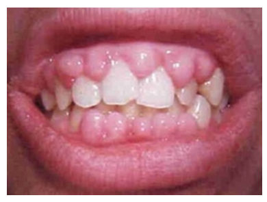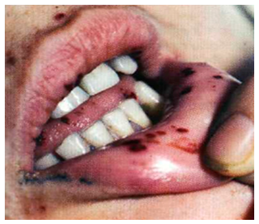 In acute leukemias, the gum mucosa overlaps onto the surface of both natural and artificial teeth (Fig. 3). | Figure 3. Patient with acute leukemia |