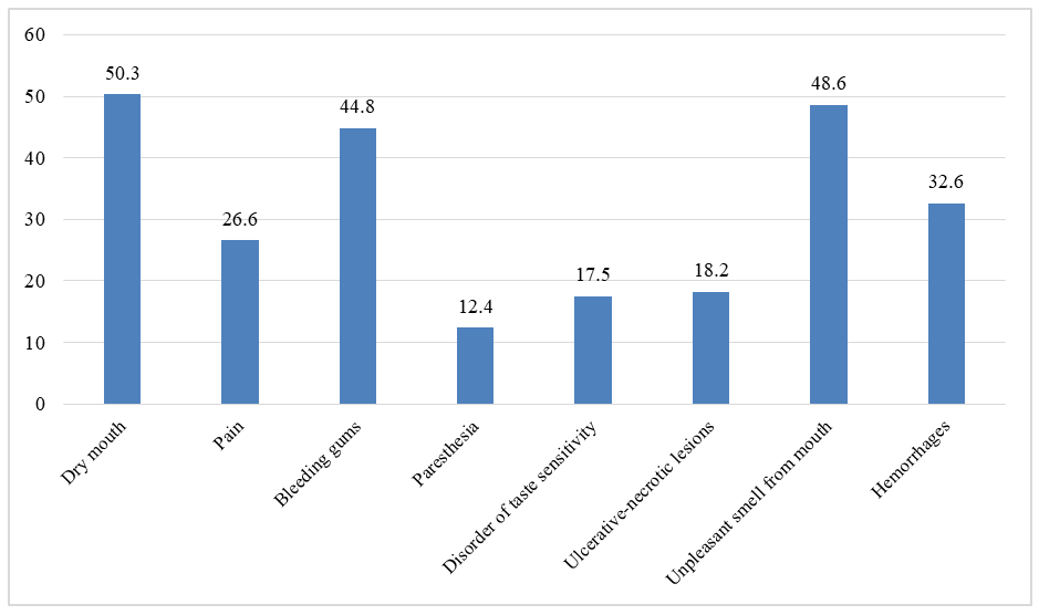 Typically, a single patient had multiple complaints. Dry mouth was reported by 50.3% of patients (Figure 4). 44.8% of patients complained of bleeding gums, with the bleeding more often being causative in nature. In 26.6% of cases, complaints were about pain, which was most frequently due to the presence of pathological changes in the mucous membrane and periodontal tissues. Sometimes there were no visible changes in the mucous membrane; however, patients complained of paresthesia as well as impaired taste sensitivity. | Figure 4. Frequency of various complaints in patients |