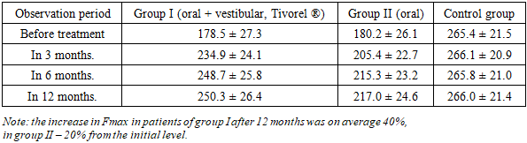 Before treatment, the average chewing force in patients with chronic generalized periodontitis was 186 ± 31.2 N in men and 171 ± 19.8 N in women. Three months after adhesive splinting, an increase of 31.7% in men and 32.7% in women was observed. By the end of the twelfth month, the indicators increased by 40.3% and 40.9%, respectively, compared to baseline values (p < 0.001).Table 1. Dynamics of chewing force (Fmax, N) in patients with periodontitis  |