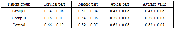 These data confirm a more pronounced restoration of functional indicators of the periodontium with bilateral splinting with drug support.Radiographic studies showed positive dynamics in the thickness of the alveolar cortical plate in patients in Group I. Three months after treatment, the cortical plate thickness was 0.43 ± 0.07 mm, and after six months, it was 0.43 ± 0.06 mm, indicating stabilization of the bone structure.In group II (splinting only on the oral side), a decrease in the thickness of the cortical plate in the middle and apical parts was recorded, while in the middle part a decrease of 54.29% from the initial data was observed.Table 2. Average cortical plate thickness (mm) 6 months after treatment  |