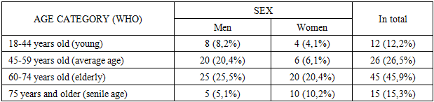 The data of examination and treatment of 98 patients who underwent urgent thoracotomy (UT) for various acute pathological processes in the organs of the thoracic cavity were analyzed. All patients were treated at the Tashkent City Clinical Hospital № 7 from 2015 to 2025. Depending on the follow-up period and the postoperative management tactics used, the patients were divided into two groups of comparable volume.All patients, depending on the treatment method, were divided into 2 groups: control group I and main group II. The control group consisted of 48 patients who were treated from 2015 to 2019 inclusive. In this group, traditional surgical tactics were used, including standard schemes for drainage of the pleural cavity, as well as an approach without using an algorithm to determine the timing of follow-up and drainage removal. The main group included 50 patients who received treatment in 2020-2025. In this group, the proposed preventive model was implemented, including the author's method of targeted drainage (utility model UZ № FAP 2441 dated 03.19.2024) and an algorithm for postoperative management based on predicting the risk of a complicated course of the postoperative course.The analysis of the age and sex structure of the studied contingent, represented by 98 patients who underwent UT, showed the predominance of older age groups, as well as the dominance of the male sex, which reflects the epidemiological and clinical features of chest pathology (table 1).Table 1. The nature of the distribution of patients by gender and age  |