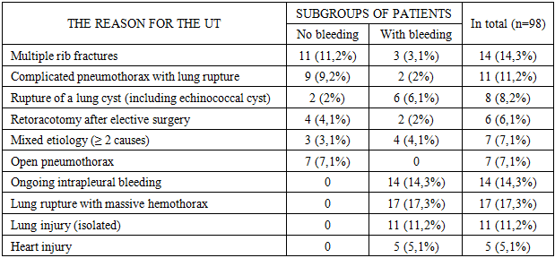 The average age of patients in the control group was 61,3±11,2 years, and in the main group it was at the level of 60,1±10,6 years. In both samples, patients over 45 years of age prevailed, while the proportion of elderly and senile people (60 years and older) accounted for more than half of the observations. Thus, 52,1% in the control group and 58% in the main group of patients were elderly and senile patients.An analysis of the distribution of causes that served as the basis for performing UT in 98 patients showed that a common cause of performing UT as a lung rupture with massive hemothorax, registered in 17 patients, which accounted for 17,3% of the total number. It is noteworthy that all these patients were admitted with obvious signs of bleeding, which underlines the severity of the clinical picture. The second place with an equal frequency (14 cases; 14,3%) was taken by a group of patients with ongoing intrapleural bleeding, mostly of an unclear or multiple nature, including after injuries, biopsies or drainage. It is important to note that here, too, bleeding was detected already upon admission (table 2).Table 2. The nature of the distribution of patients for UT reasons  |