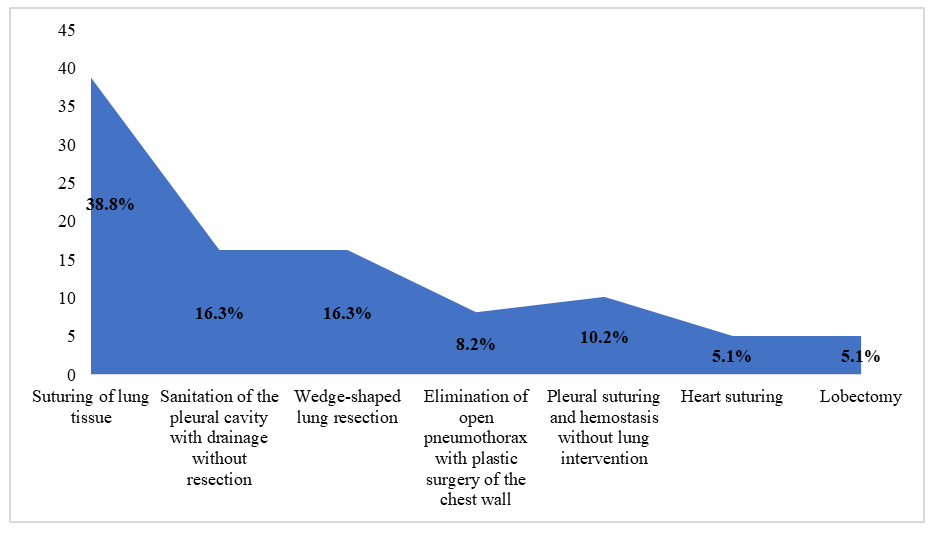 Another significant category was patients with multiple rib fractures (14 cases, 14,3%), and in fourth place was complicated pneumothorax with rupture of lung tissue (11 patients, 11,2%). The etiologically mixed group, including a combination of two or more causes (for example, rib fractures and open pneumothorax, or cyst rupture and lung injury), accounted for 7 cases (7,1%). It was in this group that a high risk of complications was most often identified, as well as the need for two-level drainage and longer follow-up.An analysis of surgical interventions performed in 98 patients included in the study showed that organ-preserving and functionally oriented techniques aimed at eliminating the main source of pathology with minimal injury were most often used (Figure 1). | Figure 1. The nature and volume of surgical interventions performed |