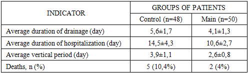 Surgical tactics under the traditional approach were characterized by variability and lack of unified principles. In some cases, the intervention was limited to pleural cavity sanitation and drainage, while in other cases, lung tissue resections of various volumes, including lobectomies, were performed. Drainage support was also not standardized, as we installed one drainage for some patients, and two drainage tubes in the presence of a hemothorax. Decisions on drainage removal were usually made empirically, without using objective scales for assessing the dynamics of pleural discharge, X-ray picture, or clinical condition.In the postoperative period, almost all patients had a pronounced inflammatory response, especially in the first three days after the intervention, which was reflected in the dynamics of body temperature, leukocyte formula, C-reactive protein level and erythrocyte sedimentation rate. In patients with initial intrapleural bleeding, compared with patients without it, there was a higher incidence of complications, including clotted hemothorax (18,8%), EP (12,5%), infected pleurisy, recurrent pneumothorax, as well as the need for repeated interventions, both with drainage and retoracotomy. At the same time, the duration of drainage and hospitalization in this subgroup was statistically significantly higher, and the timing of verticalization and recovery turned out to be later.The revealed tendency to increase mortality in patients with initial bleeding deserves special attention. If in the group without hemothorax it was 6,3%, then in the presence of bleeding this indicator increased to 12,5%. The causes of death in some cases were directly correlated with pleural complications in the form of EP, sepsis, respiratory failure, which developed against the background of prolonged drainage, decreased activity of the patient and ineffective sanitation of the pleural cavity.A summary analysis of the data obtained suggests that the existing traditional management scheme for patients after UT is largely based on the individual experience of the surgeon and does not take into account a number of key risk factors. The existing algorithmization of the decision-making system regarding the choice of drainage volume, the timing of drainage removal, as well as the organization of postoperative follow-up in debilitated and elderly and senile patients leads to a high frequency of complicated course and difficult rehabilitation.Based on the above, it is obvious that there is a need to develop an integrated approach, including the improvement of drainage techniques adapted to the nature of the intervention and the risk zone, based on objective clinical, instrumental and functional criteria. Such a solution should not only increase the efficiency of pleural cavity sanitation, but also ensure timely and safe removal of drainage load, accelerate patient activation and reduce the risk of pleuropulmonary complications.Based on the identified shortcomings of traditional drainage schemes and in order to increase the efficiency of pleural cavity sanitation, we have developed a new drainage method that is protected as a useful model. The essence of the method is as follows: a basic silicone drain with a diameter of 0,8-1,0 cm and a length of 50 cm is inserted into the pleural cavity through a single access (VII or VIII intercostal space, between the middle and posterior submuscular lines). The drainage has four lateral openings and is carried out along the lateral wall of the chest with a direction to the dome of the pleura. After installing the main drain, a second, thinner silicone drain with a diameter of 6 mm is passed through its lumen, which is precisely positioned in the most critical areas of the pleural cavity, where accumulation of pathological contents is likely.These areas include: interlobular crevices; spaces between adhesions; stump of the lung after resection (with wedge-shaped resections, lobectomy, etc.).Thanks to this solution, adequate, targeted drainage is achieved without the need for additional punctures of the chest wall, which reduces invasiveness, improves cosmetic results and reduces pain. The use of a single skin access avoids injury to the intercostal neurovascular bundles and muscle structures, especially in the upper anterior chest.A comparative analysis of the postoperative period in patients of the control and main groups, presented in table 3, allowed an objective assessment of the clinical effectiveness of preventive tactics. The comparison was based on four key parameters reflecting the dynamics of recovery, the degree of functional impairment and outcomes. Among them, the duration of drainage, the duration of hospitalization, the timing of patient activation (verticalization) and the frequency of deaths were analyzed.Table 3. Comparative assessment of the postoperative period in the control and main groups  |