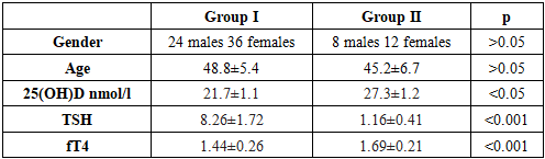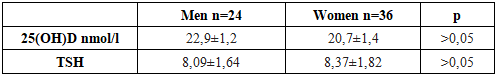 The average values of the indicators of 25(OH)D, ionized calcium, thyroid gland functional status in blood serum in the participants of the two groups are shown in Table 1. No reliable differences were found between the age and sex content groups.Table 1. The average value of indicators of groups I and II  |