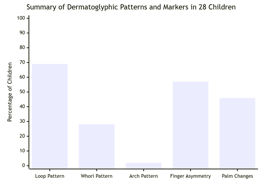 Beyond digital patterns, the study identified notable asymmetries and palmar anomalies. Bilateral finger pattern asymmetry was a prominent finding, present in 16 out of the 28 subjects. This phenomenon is theoretically grounded in developmental biology, as it is understood to reflect disruptions during the critical embryological period when genetic predispositions and potential environmental insults concurrently influence the formation of both dermal ridges and the pancreatic system. Furthermore, deviations in palmar topographic anatomy, including changes in the main line alignments and axial triradii, were recorded in 13 children, adding another layer to the observed phenotypic divergence.The collective dermatoglyphic profile elucidated in this investigation—characterized by loop dominance, specific asymmetry, and palmar structural changes—closely aligns with and corroborates extant literature on insulin-dependent diabetes mellitus. This consistency across independent studies strengthens the hypothesis of a shared developmental pathway. However, it is crucial to emphasize the interpretative boundaries of these findings. While dermatoglyphics provide a compelling, non-invasive window into potential genetic susceptibility, they lack the pathological specificity required for a definitive diagnosis. The patterns identified are probabilistic risk markers, not pathognomonic indicators. Consequently, within both clinical and forensic medical practice, dermatoglyphic analysis must be strictly conceptualized as an adjunctive, secondary tool. It can serve to enrich a multifactorial risk assessment or contribute to a forensic identification profile, but it possesses no independent diagnostic value and cannot be used to conclusively confirm or exclude a diagnosis of Type 1 Diabetes Mellitus.