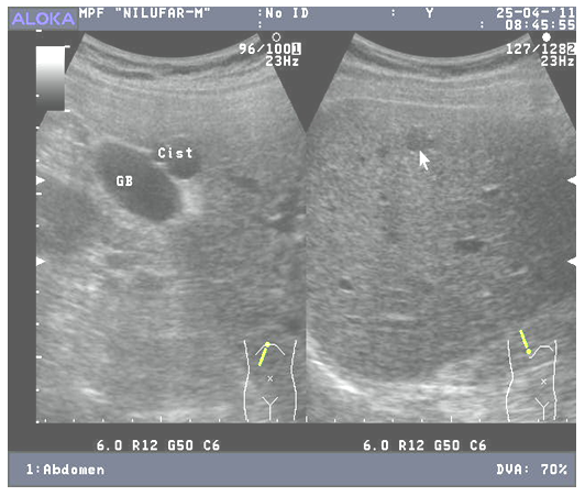 When conducting ultrasound monitoring of the condition of the residual cavity (RC) after echinococcectomy (EE) of the liver, our goal was to study the dynamics of the processes occurring in the RC after various types of operations and compare the results obtained with the methods of surgical correction. Also of scientific and practical interest is the establishment of a correlation between the clinical manifestations of RC suppuration and ultrasound data, which will allow timely therapeutic measures to be taken without bringing the process to true suppuration.21 (9.7%) patients were under observation for complicated RC after liver EE, of which 18 (14.5%) were in the comparison group, 3 (3.2%) were in the main group. The frequency of RC suppurations from the total number of patients with RC complications was 3.7% (8 patients), the presence of fluid was 5.9% (3 patients). Moreover, in the comparison group, complications of RC in the form of suppuration amounted to 6.4% (8 patients); in the main group, RC suppuration was not observed in any case. Fluid accumulation was 8.1% (10 patients) and 3.2% (3 patients). From the analysis of medical records in the comparison group, 16 (12.9%) patients with complicated residual surgery for LE were completed with external drainage of the cyst cavity, only in 2 (1.6%) the operation was completed with closed EE. In the main group, 3 (3.2%) patients with complicated RC were operated on using a combined EE method with drainage using one drainage tube.In the comparison group, 2 patients began to experience small RCs up to 1.5 cm in diameter on the 4th day. On the 5th day, the sizes of the cavities reached 3.5 and 5 cm in diameter, respectively, with liquid heterogeneous contents. In the long-term period, during dynamic ultrasound, fluid accumulation in the RC (2.5 cm) was observed at 5 months after surgery, in which no pathological accumulations in the RC were observed during ultrasound on the 2nd and 3rd days. At the 6th month, the diameter of the formation increased to 4.5 cm.We see that dynamic correction of drainages located in the RC is the most important method of preventive treatment and prophylactic measures in diagnosing signs of RC formation and infection. Our experience has shown that drains with a diameter of less than 1 cm were often used, which did not provide sufficient outflow of contents. In addition, with a reduction in the volume of RC, as well as with abdominal excursion, mixing of drainages is often observed. In this regard, we fixed the drainage with catgut thread by stitching one of its edges to the bottom of the cavity. Catgut is used 2/0 - 3/0. A drain with an internal diameter of at least 1 cm has 3-4 side holes. Next, we fix it at the outer edge of the fibrous capsule and stitch it to the skin of the anterior abdominal wall.By the time the drainage is removed on days 5-6, the catgut relaxes and the drainage is evacuated without any difficulty. In a similar way, we have already fixed drains in patients of the main group. Only 1 (1.1%) of them had mixed drains and prolapsed. Patients with RC after liver EE were characterized by a polymorphism of clinical manifestations - from a latent and asymptomatic course to the appearance of hepatomegaly. The absence of any clinical symptoms occurred in 5 (11.6%) patients; in the rest, pain, a feeling of heaviness in the upper abdomen or discomfort after eating were common. The nature of the pain and its localization depended on the size of the RC and concomitant lesions of the hepatopancreatoduodenal zone. Thus, in patients with small cavity sizes, the pain was periodic, moderately aching and localized equally often both in the right hypochondrium and in the epigastric region; in patients with large RC, the pain was constant, dull and localized mainly in the liver and right hypochondrium.The second characteristic symptom of RC after pain after EE of the liver is more or less pronounced hyperthermia with signs of intoxication of the body.Diagnosis of RC complications after liver EE included: detection of RC and its differentiation; establishing its size, prevalence and segmental localization; establishing a connection between the RC and the intrahepatic bile ducts; assessment of the nature of the content of the RC; choosing a treatment method or eliminating the need for it. After EE, dynamic ultrasound is performed from the next day. The liver was examined in both transverse, oblique, and direct directions. To capture the image, if necessary, a Polaroid photo attachment was used.Adhering to this tactic, it was possible to identify a number of characteristic sonographic signs complicated by RC and their relationship with clinical symptoms. During dynamic ultrasound of operated patients, a cavity with fluid accumulation was identified. Differential diagnosis from hydatid cysts was characterized by the presence of a double contour of liver formation. This sign in 100% of cases indicates the parasitic nature of the cyst.RC was characterized by uneven contours that had scalloped or folded outlines. At the same time, the ultrasound picture of RC and parasitic cyst differed significantly: for example, in the presence of EC disease, a smooth contour, a thin capsule and liquid, round formations inside the cavity were significantly more often detected. In the presence of RC, an uneven contour of the lesion and echogenic consolidation of pericystic tissue were more often observed (Fig. 1).  | Figure 1. Patient M. History No. 624/252. On the projection of the 7th segment, 10 x 10 x 12 mm, irregular oval shape, smooth, clear contours, have a thin capsule of 1 mm, contain liquid, the formation is in contact with the body of the gallbladder |