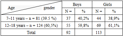 An examination was conducted on 205 children aged 7 to 18 years with type 1 diabetes mellitus (T1DM), including 92 boys (45%) and 113 girls (55%). Children aged 7 to 11 years (mean age 9.0±1.6 years) accounted for 81 patients (39.5%), while 124 patients aged 12 to 18 years (mean age 14.7±1.8 years) were examined (60.5%) (Table 1).Table 1. Distribution of examined patients by age (according to the classification of N. P. Gundobin, modified by A. V. Mazurin and I. M. Vorontsov, 1985) and gender  |