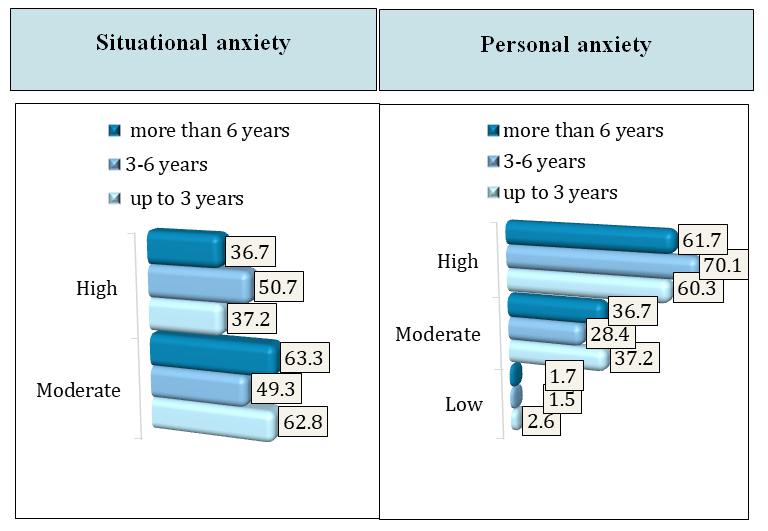 In the comparative assessment of HbA1c values considering the duration of the disease, we found that in the first 1.5–2 years from the onset of diabetes, glycated hemoglobin levels were significantly lower, averaging 8.5%. In the group with a disease duration of 3 to 6 years, or more precisely by the middle of the third year of diabetes, carbohydrate metabolism indicators worsened, and their average values were significantly higher than in children with a disease duration of up to 3 years – 9.4% (p < 0.001). In patients with a longer duration of diabetes, the trend toward worsening HbA1c levels persisted and was on average significantly higher – 10.4% (p < 0.001) than in groups with shorter disease duration.During the analysis of individual tasks of the MoCA test, it was determined that patients with type 1 diabetes performed significantly worse on the 'clock' (p<0.001), 'attention' (p<0.001), 'phrase repetition' (p<0.001), and 'delayed recall' (p<0.001) tasks compared to the control group. The anxiety test results demonstrated the presence of moderate situational anxiety in 120 (58.5%) patients and high situational anxiety in 85 (41.4%) children. Regarding trait anxiety, it was detected at a low level in 4 (2%) patients, at a moderate level in 70 (34%) cases, and at a high level in 131 (64%) patients. Anxiety testing results, taking into account the duration of type 1 diabetes, showed that a moderate level of situational anxiety in the group of children with a disease duration of less than 3 years was observed in 62.8% of cases, with a duration of 3 to 6 years in 49.3% of children, and for more than 6 years in 63.3% of patients. A high level of stress (ST) in patients with a disease duration of less than 3 years was observed in 37.2% of cases, from 3 to 6 years in 50.7% of children, and in the group with a duration of more than 6 years in 36.7% of patients. According to the personal anxiety scale, a moderate level in children with a disease duration of less than 3 years was determined in 37.2% of episodes, from 3 to 6 years in 28.4% of patients, and in those with a longer period of pathology in 36.7% of children. A high degree of personal anxiety in this category of patients was identified in 60.3%, 70.1%, and 61.7% of cases, respectively (Fig. 1). | Figure 1. Levels of situational and personal anxiety in children and adolescents with type 1 diabetes |