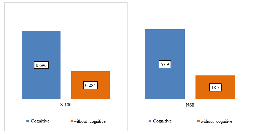When assessing the 'State Anxiety Scale' indicator depending on the duration of diabetes, no statistically significant differences were found (P = 0.171) (method used: Pearson's Chi-square). When comparing the 'Trait Anxiety Scale' indicator depending on the duration of diabetes, no statistically significant differences were found (P = 0.764) (method used: Pearson's Chi-square).An assessment of S-100 and NSE protein levels was conducted. In this case, the control group consisted of children with type 1 diabetes who did not have cognitive impairments. The S-100 protein level in patients with cognitive manifestations was significantly higher at 0.696 µg/L, compared both to patients without cognitive impairments (0.284 µg/L) and to its reference values. | Figure 2. Analysis of S-100 and NSE proteins depending on the presence of cognitive impairments |