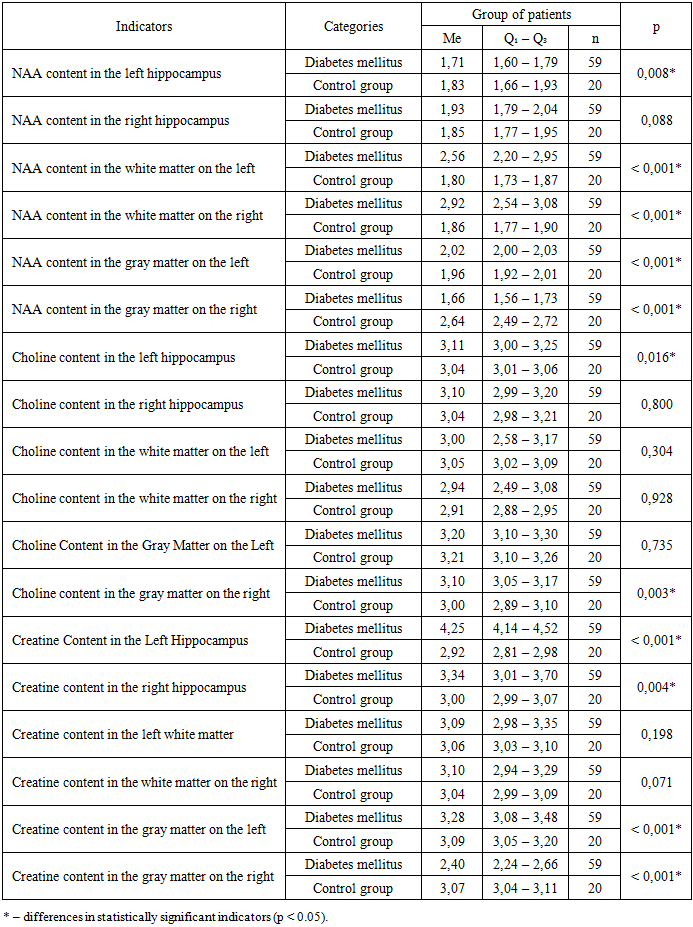 A similar pattern was observed in the analysis of neuron-specific enolase results. In children with cognitive deficits, the protein concentration was significantly higher – 53.9 µg/L – compared both to patients without cognitive disorders – 18.5 µg/L – and to reference values. According to the results of neuropsychological testing and anxiety tests, there were found significant correlations with the enzyme-linked immunosorbent assay protein levels (p <0.001*). Thus, with an increase in S-100 by –0.065, the expected decrease in MoCA test points is –1 point. With an increase in NSE by –7.618, the expected decrease in MoCA test points is –1 point. With an increase in S-100 by 0.017, an increase of 1 point in the state anxiety scale is expected. With an increase in NSE by 1.431, an increase of 1 point in the state anxiety scale is expected. With an increase in S-100 by 0.015, an increase of 1 point in the trait anxiety scale is expected. With an increase in NSE by 1.223, an increase of 1 point in the state anxiety scale is expected.In order to achieve early verification of the main pathological changes occurring in the brain, a study of the brain metabolite content and their ratios was conducted using proton magnetic resonance spectroscopy. The results showed a significant reduction in N-acetylaspartate levels compared to the control group in the left hippocampus – 1.71 mmol/L, and in the right gray matter – 1.66 mmol/L. Additionally, there was a significant increase in NAA in the white matter on both sides – 2.56 mmol/L (Table 2).Table 2. Analysis of brain metabolites in children and adolescents depending on the presence of type 1 diabetes  |