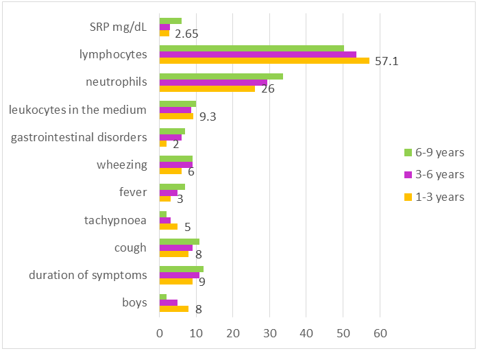 In the 1-3 year old group (OR = 8.67, 95% CI = 4.69–16.04, P < 0.001), it was significantly higher than in the other groups; this result indicates that young infants were more susceptible to M. pneumoniae infection.A study of seasonal incidence showed that the peak incidence of M. pneumoniae infection occurred in October, with a total of 15 (62.5%) cases recorded in the study group (n=24) during that month. Seasonal distribution of M. pneumoniae infection in the study group of children: from January to March, there were no cases; from April to June, 2 (8.4%) children were infected with M. pneumoniae; and from July to September, 4 (16.6%) children were infected. from October to December, 18 (75%) children were infected with M. pneumoniae. These data showed that the prevalence of M. pneumoniae infection in children was higher in the fourth quarter of the year. | Figure 2. Average clinical and laboratory parameters in the study groups |