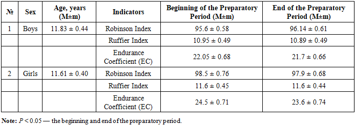 Functional tests make it possible to assess the general condition of the body, its reserve capacities, and the features of adaptation of various systems to physical loads [15]. One of the simplest tests is the Ruffier test, which helps to evaluate the level of adaptive reserves and the functional performance of the cardiovascular system using a single standardized physical load, based on heart rate values at different recovery times after exercise. Changes in heart rate ensure the adaptation of the circulatory system to the body’s needs and environmental conditions. The increase in heart rate follows a linear dependence: the better the heart is adapted to the load, the smaller the tachycardia after it, and vice versa [14]. Hence, there is an inverse relationship between the Ruffier index and performance capacity: the higher the Ruffier index, the poorer the adaptive capabilities of the cardiovascular system. High performance capacity serves as an indicator of stable health, while low values are considered a health risk factor [14,17].At the beginning and at the end of the preparatory training period, the Robinson Index in boys was below the average value, as in girls. However, in boys, the index increased by 0.56% by the end of the preparatory period. In girls, on the contrary, the Robinson Index decreased by 0.6%. This indicates that the systolic work of the heart and its functional capacity in the preparatory period improved in girls, unlike in boys.The Ruffier Index during the preparatory training period was assessed as satisfactory in both boys and girls, both at the beginning and at the end of this period. However, by the end of the preparatory period, this index decreased by 0.55% in boys, indicating an increase in physical performance, while in girls it remained stable.The endurance coefficient during the preparatory training period decreased dynamically in all athletes from the beginning to the end of the period: by 1.58% in boys and by 3.67% in girls, which indicates an improvement in the functional capabilities of the cardiovascular system of the athletes (Table 1).Table 1. Characteristics of Performance and Endurance Indicators of Young Swimmers during the Preparatory Training Period (M±m)  |