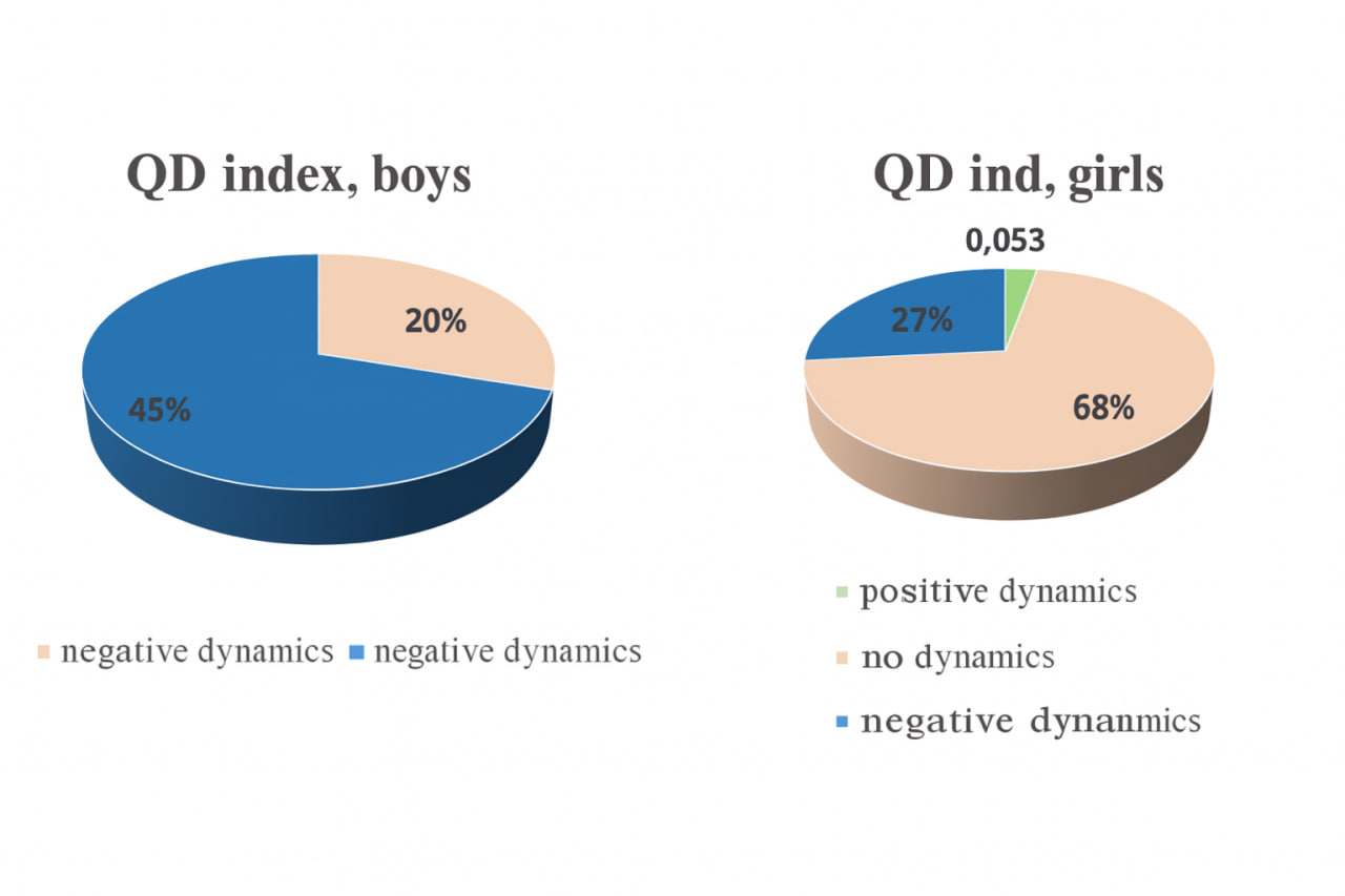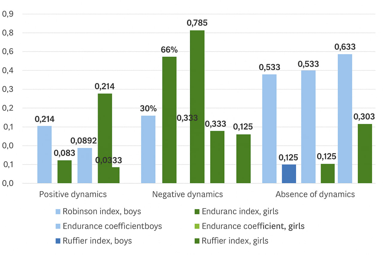 The Endurance Coefficient (EC) in boys did not increase; 80% showed a negative trend, while 20% showed neither an increase nor a decrease in the index throuhout the basic training period. Among girls, this ratio was 5.3%: 67.8%: 26.7% (Figure 4).  | Figure 4. The specific ratio of athletes with positive, negative, and no dynamics of the cardiovascular index during the basic training period |