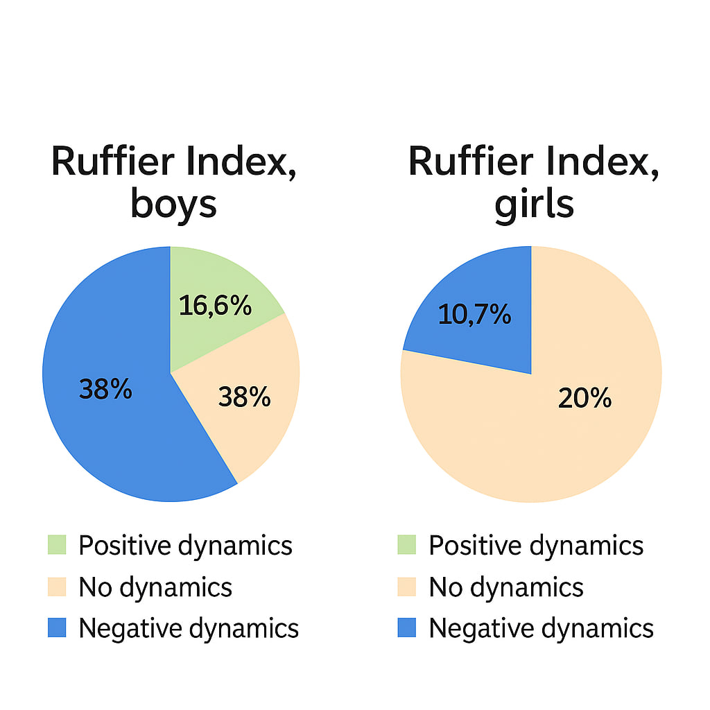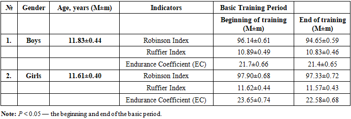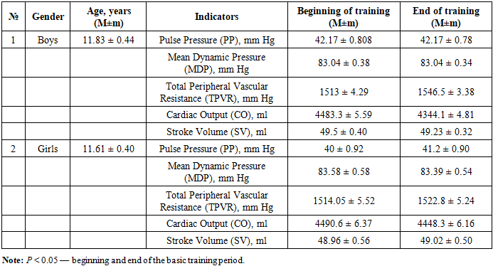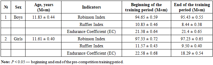 The study was conducted at the Andijan City Specialized Children’s and Youth Sports School of Swimming. The main group consisted of 60 boys aged 11.8 ± 0.43 years and 56 girls aged 11.6 ± 0.40 years engaged in swimming. The obtained results were analyzed in comparison with generally accepted standards.The Ruffier test was performed after 5–10 minutes of rest. The pulse rate was measured at rest in a sitting position (P1). Then, the subject performed 30 squats in 45 seconds, after which, while sitting, the pulse readings were recorded during the first 15 seconds (P2). The third indicator (P3) was the number of heartbeats during the last 15 seconds of the first minute of rest after the squats. The Ruffier Index (I) was calculated using the following formula: I = 4 × (P1 + P2 + P3) – 200 / 10. Interpretation of the Ruffier Index for 11-year-olds: 18 and above – unsatisfactory, 14–18 – low physical performance, 9–13 – satisfactory performance, 3.5–9 – good, up to 3 – excellent.To assess the endurance coefficient (EC), regional standards were used, according to which the normal EC value for preschool and primary school children corresponds to 22–24 conventional units, and for middle school children – 19–22 conventional units. An increase in this indicator indicates a decrease in the functional capabilities of the cardiovascular system, while a decrease, on the contrary, indicates an improvement [11].The Robinson Index characterizes the state of regulation of the cardiovascular system and reflects the degree of adaptation to loads. The Robinson Index characterizes the state of regulation of the cardiovascular system and was calculated using the formula: DP = HR × SAP / 100 [4,7]. According to the level of the Robinson Index at rest, the level of physical health and the functional state of the cardiovascular system are characterized as low at DP >111 conventional units, below average – 95–100 conventional units, average – 85–94 conventional units.Pulse pressure was calculated using the formula: PP = SAP – DAP, where SAP – systolic arterial pressure, mmHg; DAP – diastolic arterial pressure, mmHg. The mean dynamic pressure was calculated using the formula: MDP = DAP + 0.42PP, where DAP – diastolic pressure, mmHg; PP – pulse pressure, mmHg. Total peripheral resistance was calculated using the formula: TPR = MDP × 1333 × 60 / CO, where MDP – mean dynamic pressure, mmHg; CO – cardiac output, ml; 1333 – coefficient for conversion to dynes; 60 – number of seconds in a minute.Cardiac output (CO) was calculated using the formula: CO = SV × HR, where SV – stroke volume, ml; HR – heart rate, beats/min. The stroke volume value was determined by calculation using the formula: SV = 100 + 0.5PP – 0.6SAP – 0.6A, where PP – pulse pressure, mmHg; SAP – systolic arterial pressure, mmHg; A – age, years.The Functional Changes Index (FCI) is an indicator of the adaptive potential of the circulatory system. It was calculated using the following formula:FCI = 0.011×HR + 0.014×SAP + 0.008×DAP + 0.014×A + 0.009×BW – 0.009×H – 0.27,where HR – resting heart rate (beats/min), SAP – systolic arterial pressure (mmHg), DAP – diastolic arterial pressure (mmHg), A – age (years), BW – body weight (kg), H – height (cm).An FCI value up to 2.6 indicates satisfactory functioning of the circulatory system. An FCI from 2.6 to 3.1 indicates functional strain, from 3.1 to 3.5 – unsatisfactory function, and above 3.5 – a breakdown in the function of the circulatory system.To calculate the adaptive potential (AP), many authors use the equation of L.A. Konevskikh (Patent RU 2314019 “Method for Assessing Adaptive Potential” / L.A. Konevskikh, I.E. Oransky, E.I. Likhacheva) [3]:AP = 1.238 + 0.09×HR,where AP – adaptive potential in conventional units (points); HR – heart rate (beats/min); 1.238 and 0.09 – coefficients of the equation.If the value is less than 7.2 points, the adaptive potential is considered satisfactory. The tension of adaptive mechanisms is observed at values from 7.21 to 8.24 points. With AP values ranging from 8.25 to 9.85 points, adaptation is considered unsatisfactory, and values above 9.86 points indicate a breakdown of adaptive mechanisms.Statistical analysis methods included frequency analysis (%), variation statistics (arithmetic mean – M, standard error – ±m). To determine the significance of differences between mean values, Student’s t-test was used. Differences between mean arithmetic values were considered statistically significant at p ≤ 0.05.