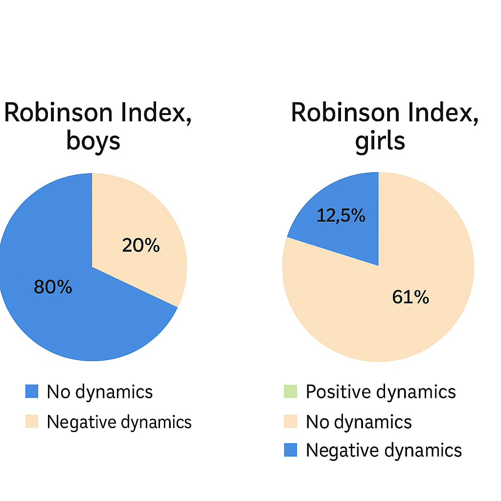 It is noteworthy that among young swimmers, both boys and girls, the dynamics of the indices within the groups are ambiguous. As shown in Figure 2, an increase in the Robinson index from the beginning to the end of the basic training period was not observed; a decrease in this index was noted in 80% of athletes within the group, and in 20% there were practically no changes in the Robinson index by the end of the basic period. In girls, the following results were obtained: 12.5%: 60.7%: 26.7%, respectively. | Figure 2. The specific ratio of athletes with positive, negative, and no dynamics of the Robinson Index during the basic training period |