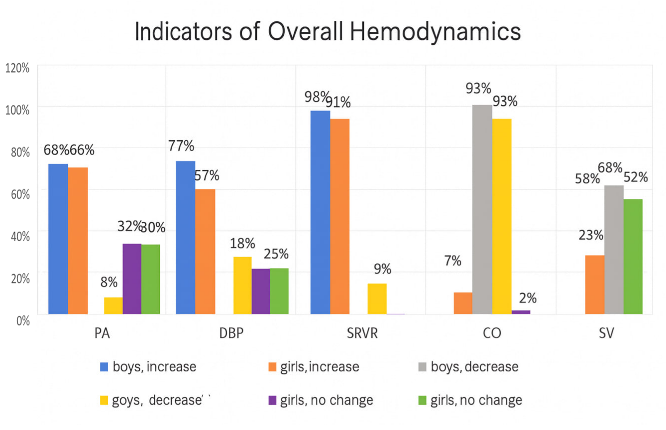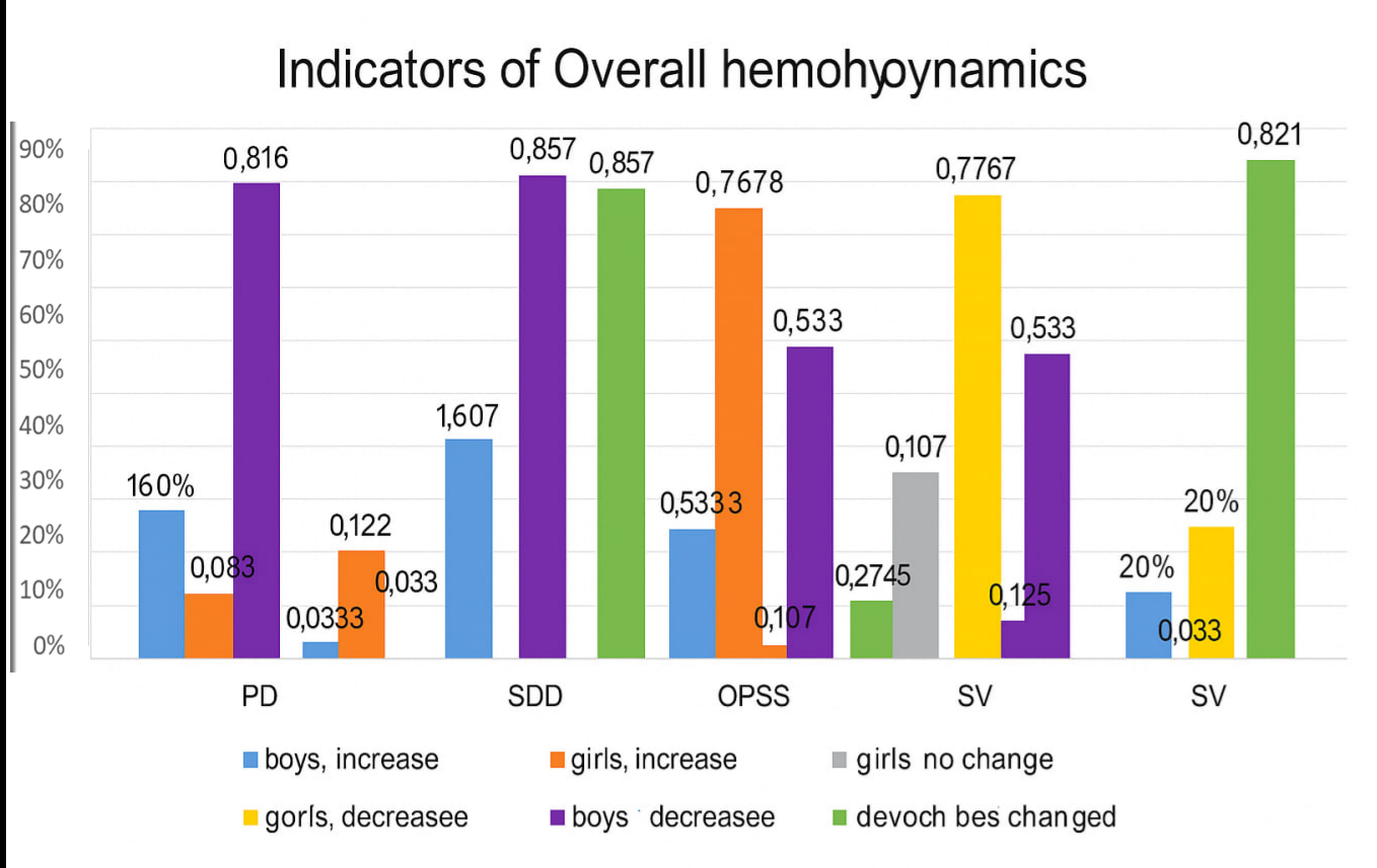 By the end of the pre-competition training period, in boys, pulse pressure (PP) remained unchanged, mean dynamic pressure increased by 3.73%, total peripheral resistance (TPR) increased by 0.41%, while cardiac output (CO) decreased by 7.38% and stroke volume (SV) decreased by 2.94%. In girls, by the end of the pre-competition period, there was an increase in PP by 16.26%, systolic blood pressure (SBP) by 2.08%, TPR by 7.99%, and a decrease in SV by 1.06% and CO by 0.13% (Table 6).It is noteworthy that the dynamics of hemodynamic indices within each group were inconsistent. In boys, an increase in PP was observed in 66% of cases, a decrease in 3.57%, and no change in 30.3% of athletes. In girls, PP increased in 66% of cases, decreased in 3.57%, and remained practically unchanged in 30.3%.SBP increased in 57.1% of boys, decreased in 17.8%, and remained almost unchanged in 25%. In girls, SBP increased in 57.1%, decreased in 17.8%, and remained unchanged in 25% of athletes.An increase in TPR was observed in 91.07% of boys, while a decrease was detected in 8.9%. In girls, the distribution of these changes was identical: 91.07%: 8.9%. No athletes, either boys or girls, showed unchanged TPR by the end of the pre-competition period.CO in boys increased in 7.14% of cases and decreased in 92.8%. In girls, the distribution was the same: 7.14%: 92.8%. No athletes in either group showed unchanged CO by the end of the pre-competition period.Stroke volume in male swimmers increased in 23.2% of cases, decreased in 60.7%, and remained practically unchanged in 16.07%. In girls, SV changed similarly: it increased in 23.2%, decreased in 60.7%, and remained unchanged in 16.07% of athletes. | Figure 7. Relative distribution of athletes with positive, negative, and unchanged indicators of overall hemodynamics during the pre-competition training period |