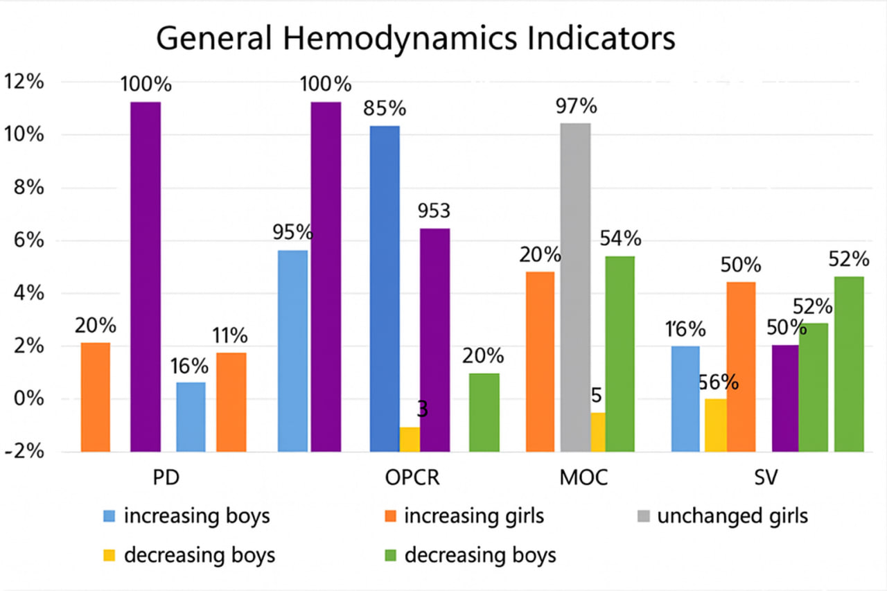 By the end of the basic training period, in boys, the following hemodynamic indices were observed: pulse pressure and mean dynamic pressure remained practically unchanged, total peripheral resistance (TPR) increased by 2.21%, cardiac output (CO) decreased by 3.10%, and stroke volume (SV) decreased by 0.54%. In girls, by the end of the preparatory period, there was an increase in pulse pressure (PP) by 3%, TPR by 0.57%, SV by 0.125, and a decrease in systolic blood pressure (SBP) by 0.22%, CO by 0.94% (Table 5).It is noteworthy that among young swimmers, the dynamics of indices within each group were inconsistent. In girls, an increase in pulse pressure was observed in 19.6% of cases, while in 80.3% of athletes, the indicator remained almost unchanged from the beginning to the end of the basic training period. SBP increased in 10.7% of girls, decreased in 16.07%, and remained practically unchanged in 73.2%.An increase in total peripheral resistance was observed in 95% of boys, no decrease was detected, and no change by the end of the basic training period was observed in 3.5% of athletes. In girls, the distribution of these changes was as follows: 53.5%: 19.6%: 26.7%.Cardiac output in boys did not increase during the basic training period; it decreased in 96.6% and remained unchanged in 3.33%. In girls, the distribution of these changes was as follows: 19.6%: 53.5%: 26.7%.Stroke volume in male swimmers did not increase; in 50% it decreased and in 50% it remained practically unchanged. In girls, stroke volume also changed inconsistently: it increased in 16.07% of cases, decreased in 32.1%, and remained unchanged in 51.7% of athletes. | Figure 6. Relative distribution of athletes with positive, negative, and unchanged indicators of overall hemodynamics during the basic training period |