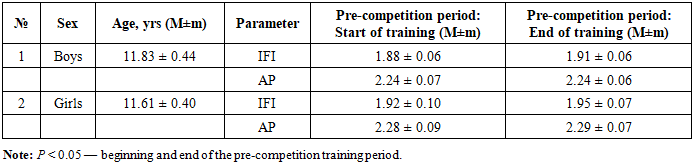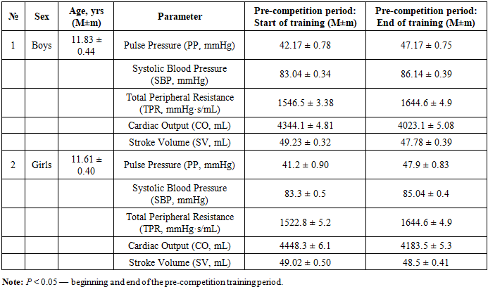 Table 6. Characteristics of overall hemodynamic indicators in young swimmers during the pre-competition period of their training (M ± m)  |