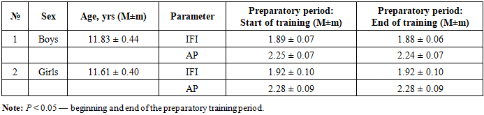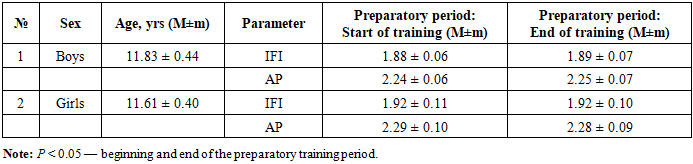 Table 7. Characteristics of overall hemodynamic indicators in young swimmers during the preparatory period of their training (M ± m)  |